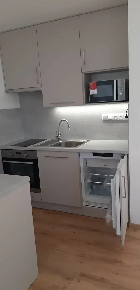 nabízíme k pronájmu velmi pěkný, prosluněný, nový byt 1+KK v klidné části centra Břeclavi. Byt se nachází v prvním patře menšího, klidného, moderního a velmi pečlivě udržovaného bytového domu. Byt, disponující moderním, dobře údržovatelným interiérem, obsahuje vstupní předsíň, pokoj s kuchyňským koutem a krásnou koupelnu s vanou, pračkou a WC. Byt je vybaven novým kuchyňským koutem s vestavenými spotřebiči (indukční varná deska, trouba, mikrovlnka, digestoř, lednička) a kuchyňským ostrůvkem se dvěma židlemi. Pronájem předmětného bytu je výbornou volbou pro klienty, kteří hledají klidné a moderní bydlení v centru města. K bytu dále náleží prostorný sklep.