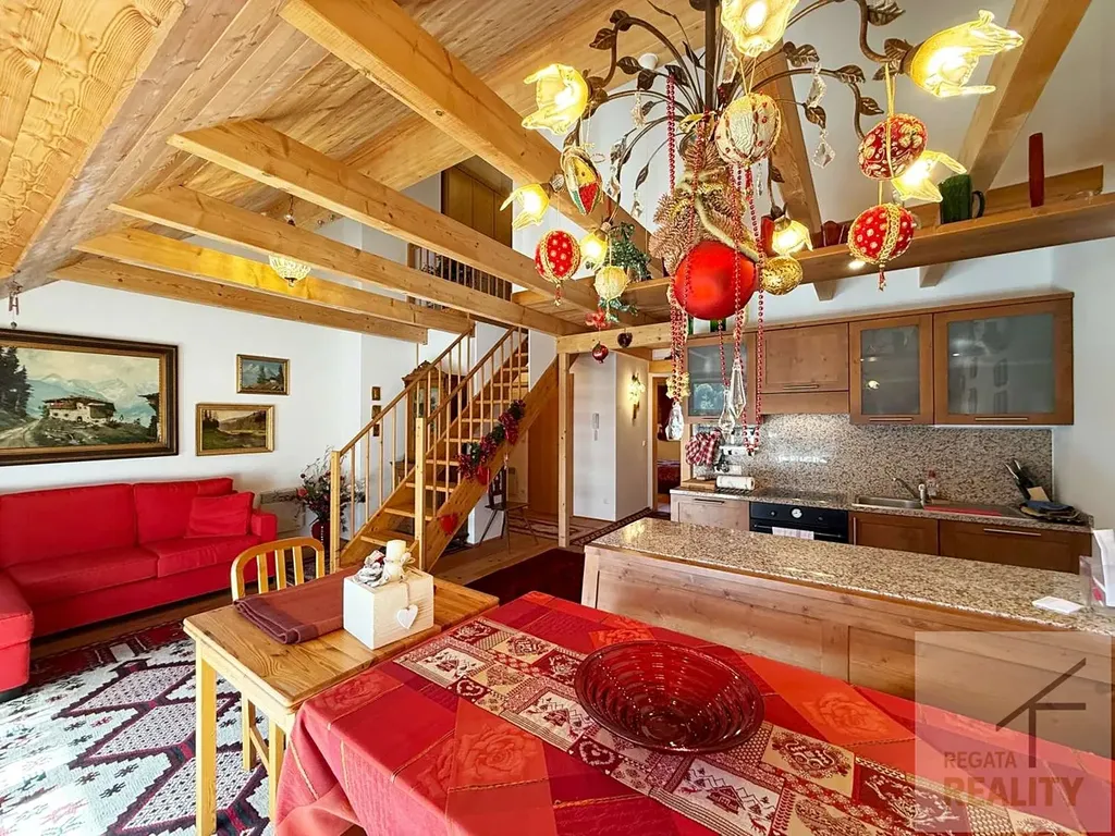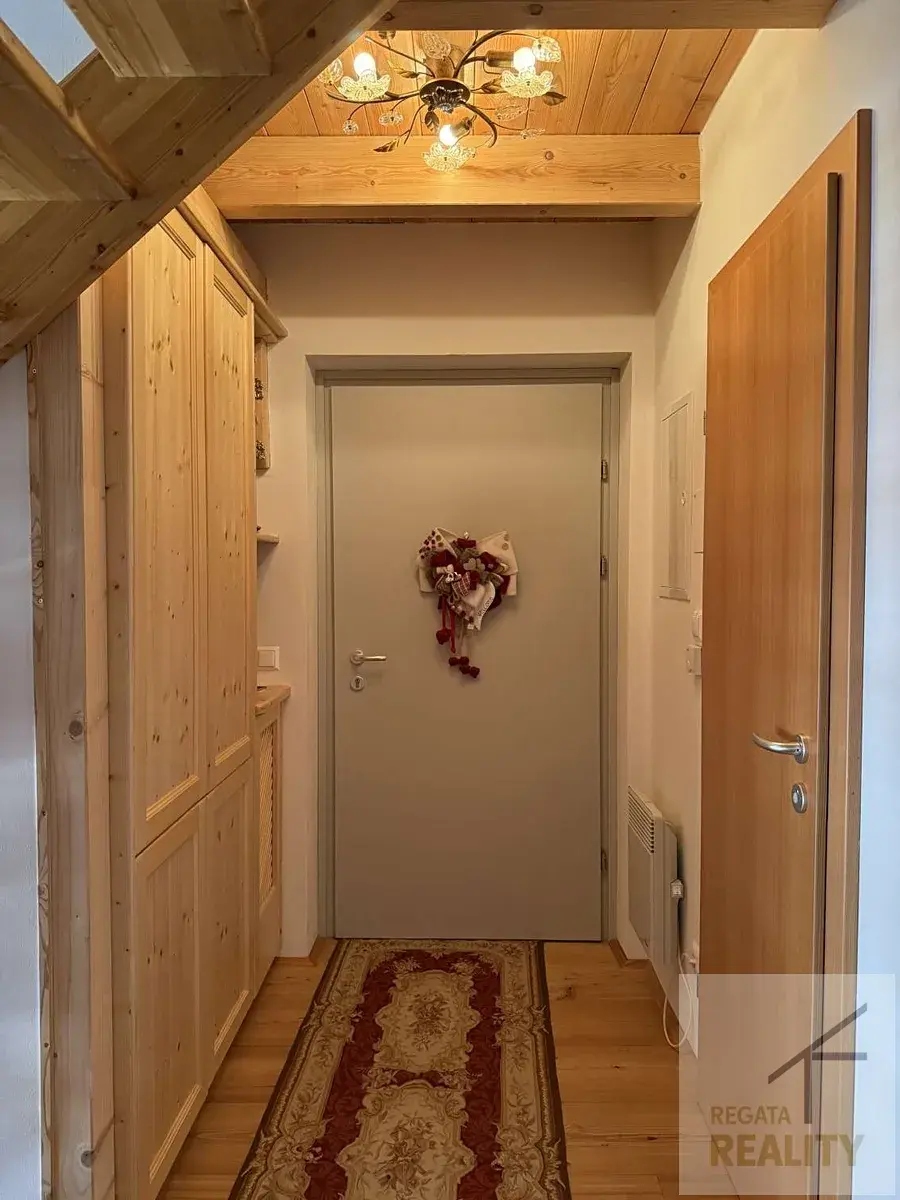 Mezonetový styl bytu přidává na atraktivitě a prostoru, který je dobře využitý. V celém bytě se nachází stylový nábytek na míru. Dále je k bytu přiděleno garážové stání a sklep, což zajišťuje dostatek úložného prostoru a pohodlí parkování. Topení je elektrické. Měsíční zálohové platby 236 € + elektřina.