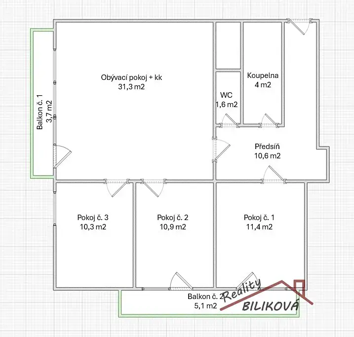 Vstup na balkony (3,7 a 5,1m2) z obývacího pokoje a dvou pokojů.