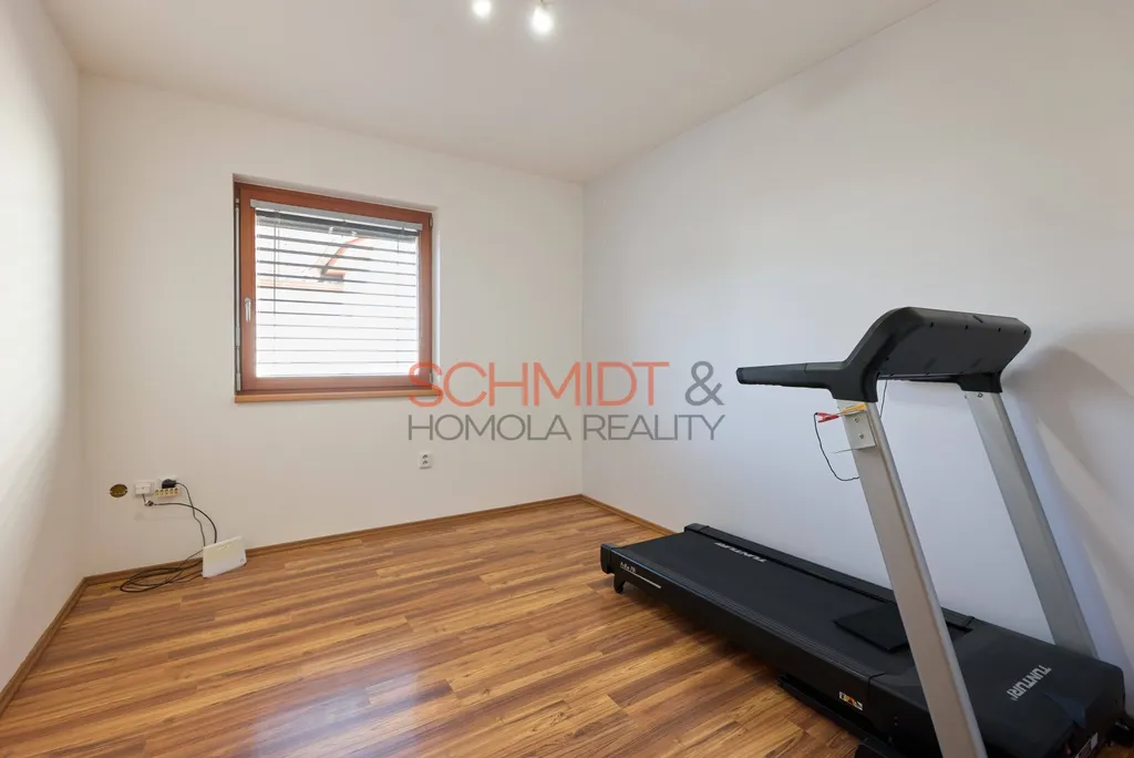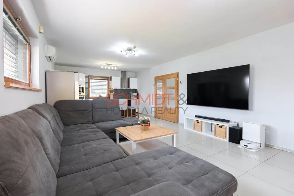 prostorný obývací pokoj spojený s jídelnou a kuchyní se vstupem na terasu, na kterou se dostaneme také z hlavní ložnice. Dále dva dětské pokoje, koupelna s vanou i sprchovým koutem, oddělené WC, technická místnost a v neposlední řadě půdní prostor upravený na další velkou obytnou místnost. Na ni navazuje další část půdy, sloužící jako šatna či sklad.