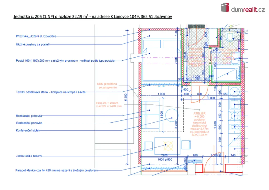 Dumrealit.cz Vám zprostředkuje prodej ateliéru (jednotky) 1+kk o velikosti 32,19 m² v Jáchymově okr. Karlovy Vary, ulice K Lanovce. Nebytový prostor byl v roce 2023 rekonstruován a zkolaudován na „Ateliér“, který je v osobním vlastnictví a nachází se v 1. nadzemním podlaží (celkem 5 NP) zatepleného cihlového domu s výtahem, jižní východ /tzv. francouzské okno/ je do dvora za domem, dveře a okna jsou plastová. Podlahová krytina v chodbě a v koupelně je z dlažby, ostatní podlaha je laminátová. Koupelnu s WC, umyvadlem se skříňkou včetně sanity, sprchovým koutem a otopným žebříkem; kuchyňská linka s varnou deskou a digestoří, dřezem a vestavěnou mikrovlnnou troubou. Byt je dispozičně upraven tak, že máte oddělenou spací část a obývací pokoj. Vytápění bytu je ústřední topení zajištěno centrální plynovou kotelnou pro bytový dům; teplá voda ohřev el. bojler; studená voda je dodávána z veřejného vodovodního řadu, stejně tak kanalizace je napojena na veřejný řad. Byt se nabízí k prodeji s vybavením.