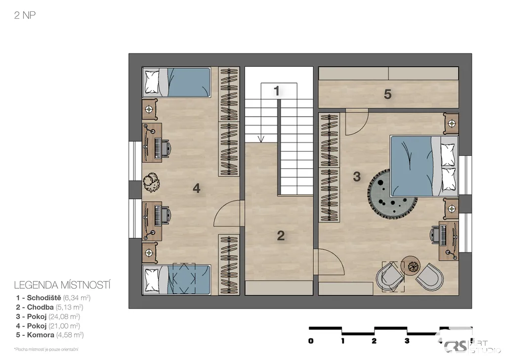Skládá se z pěti pokojů, kuchyně, koupelny s vanou a sprchovým koutem, samostatné toalety a spíže.