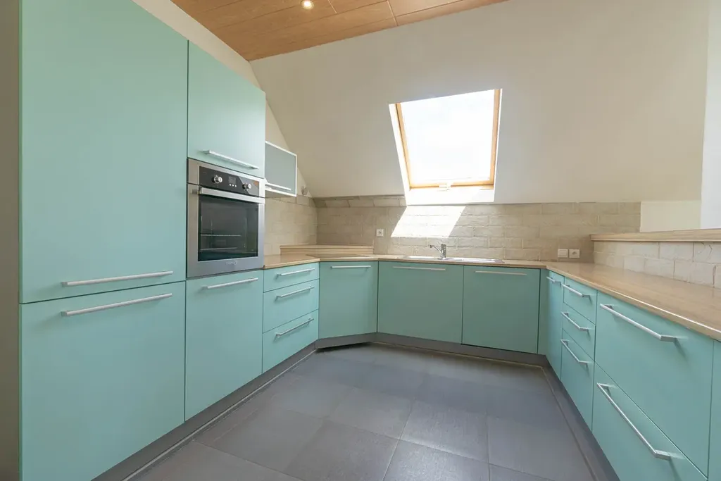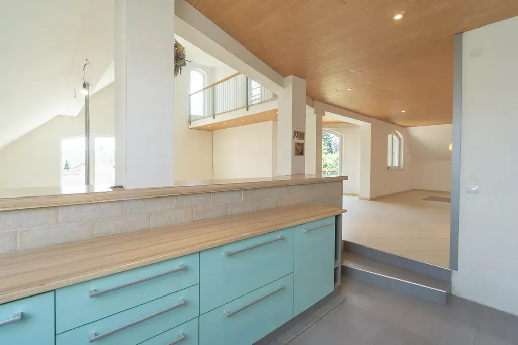 nadzemním podlaží je vstupní hala (13,6 m2) a hlavní obytný prostor - nalezneme tu velkorysý prostor tvořený obývacím pokojem (44,2 m2), na něj navazující jídelnou (33,3 m2) a kuchyní (12,1 m2), která je oddělena barovým pultem. Celý prostor je velmi vzdušný a otevřený směrem na jihovýchod do zahrady, dojem životního prostoru umocňuje vysoký strop zasahující až ke galerii ve druhém nadzemním podlaží. Prostory ještě doplňuje prostorný balkon (10,2 m2). Vyjma hlavní obývají části v nižším patře nalezneme ještě koupelnu s vanou (10,8 m2), samostatné WC (1,9 m2) a tři útulné pokoje/ ložnice (17,4 + 15,6 + 10,4 m2). Prostory ve vyšším patře tvoří galerie (33,6 m2), balkon (5,2 m2) a původní technická část/ půda (45,2 m2), která může být přetvořena na další obytné prostory.