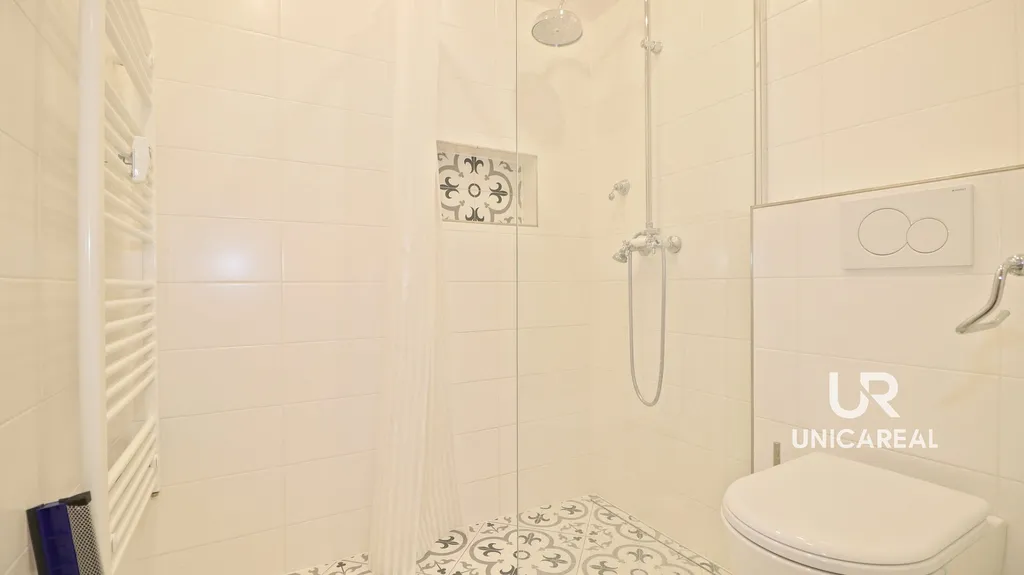 Stylová koupelna je moderně řešená a disponuje sprchovým koutem, umyvadlem, toaletou i dostatečným prostorem pro umístění pračky.