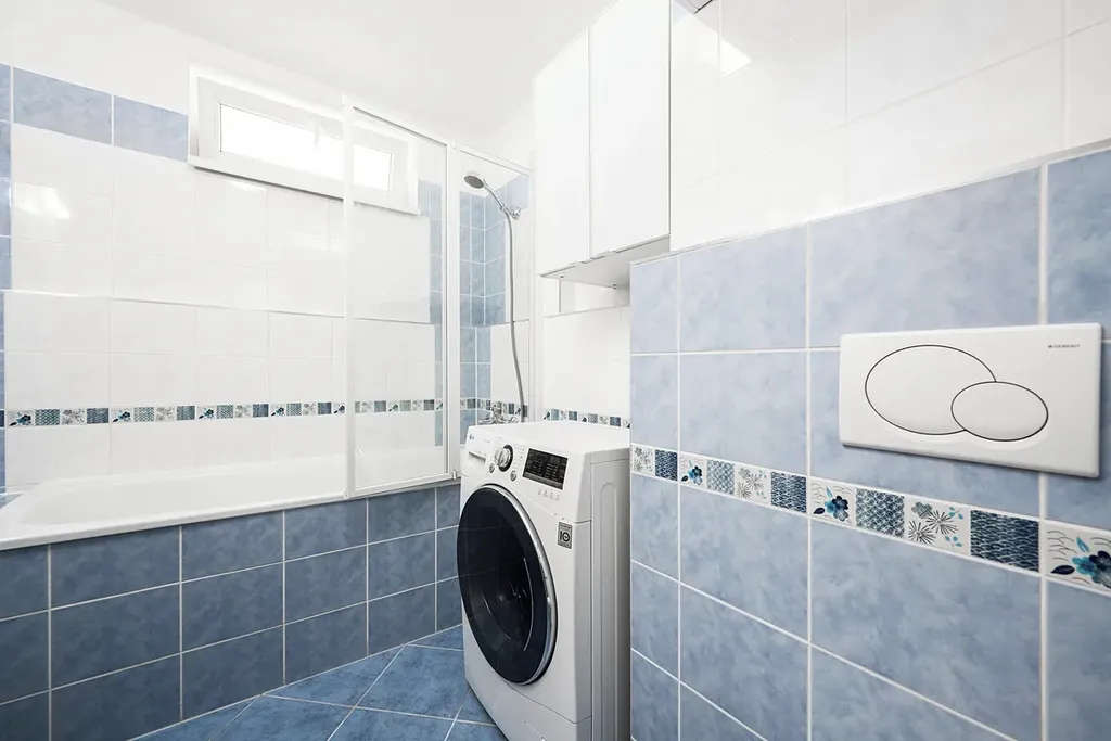 Koupelna s vanou, umyvadlem, wc a pračkou