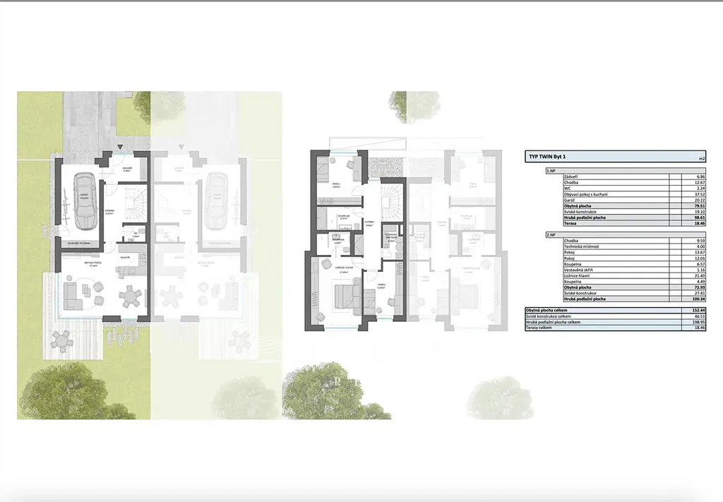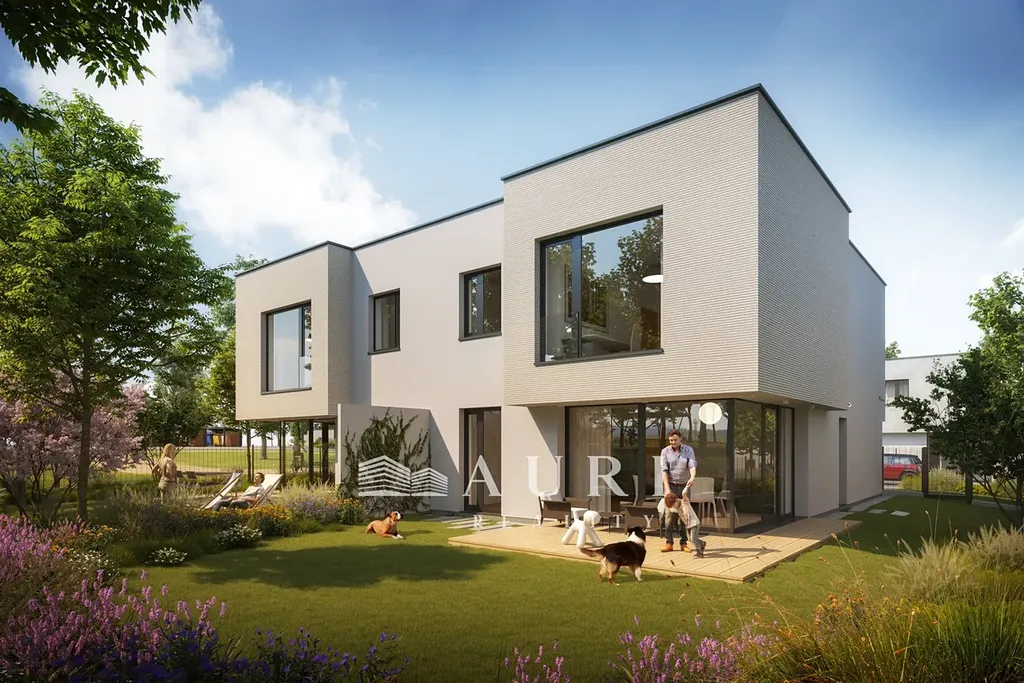 Vila 1 bude součástí moderního dvojdomu umístěného na pozemcích – parc. č. 3841/360 o výměře 719 m² a 3841/301 o výměře 301 m², takže nabídne dostatek soukromí i prostoru pro rodinný život. Zahrada orientovaná na jih zajistí slunce po celý den a příjemné posezení na terase. Výstavba je plánována na začátek roku 2026 a celý projekt aspiruje na provedení ve standardu Bytecheck Best Practice, což zaručuje špičkovou kvalitu a dlouhodobou hodnotu investice.