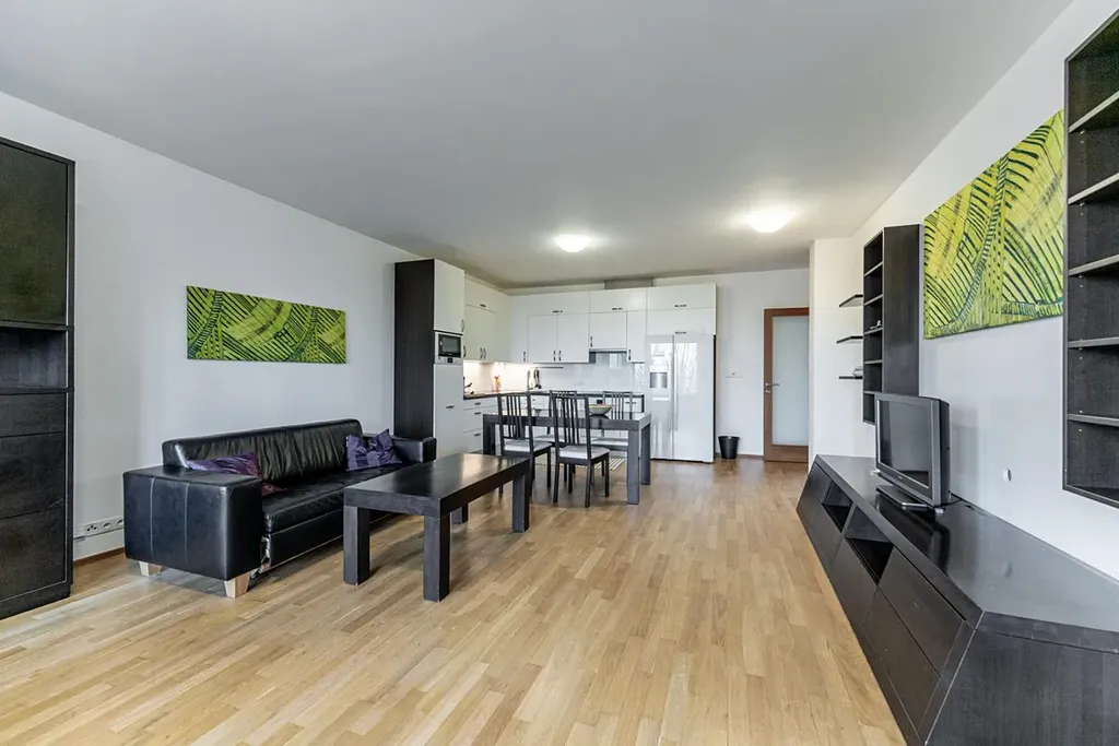 Dispozice: Jednotka sestává z velkorysého obývacího pokoje (42,5 m2) s kuchyňským koutem s vestavnými spotřebiči a výhledem do zeleně, ložnice s šatnou (23,4 m2), předsíň s chodbou (10,5 m2), komora (5,6 m2), koupelna s toaletou (5 m2) a samostatná toaleta (1,8 m2).