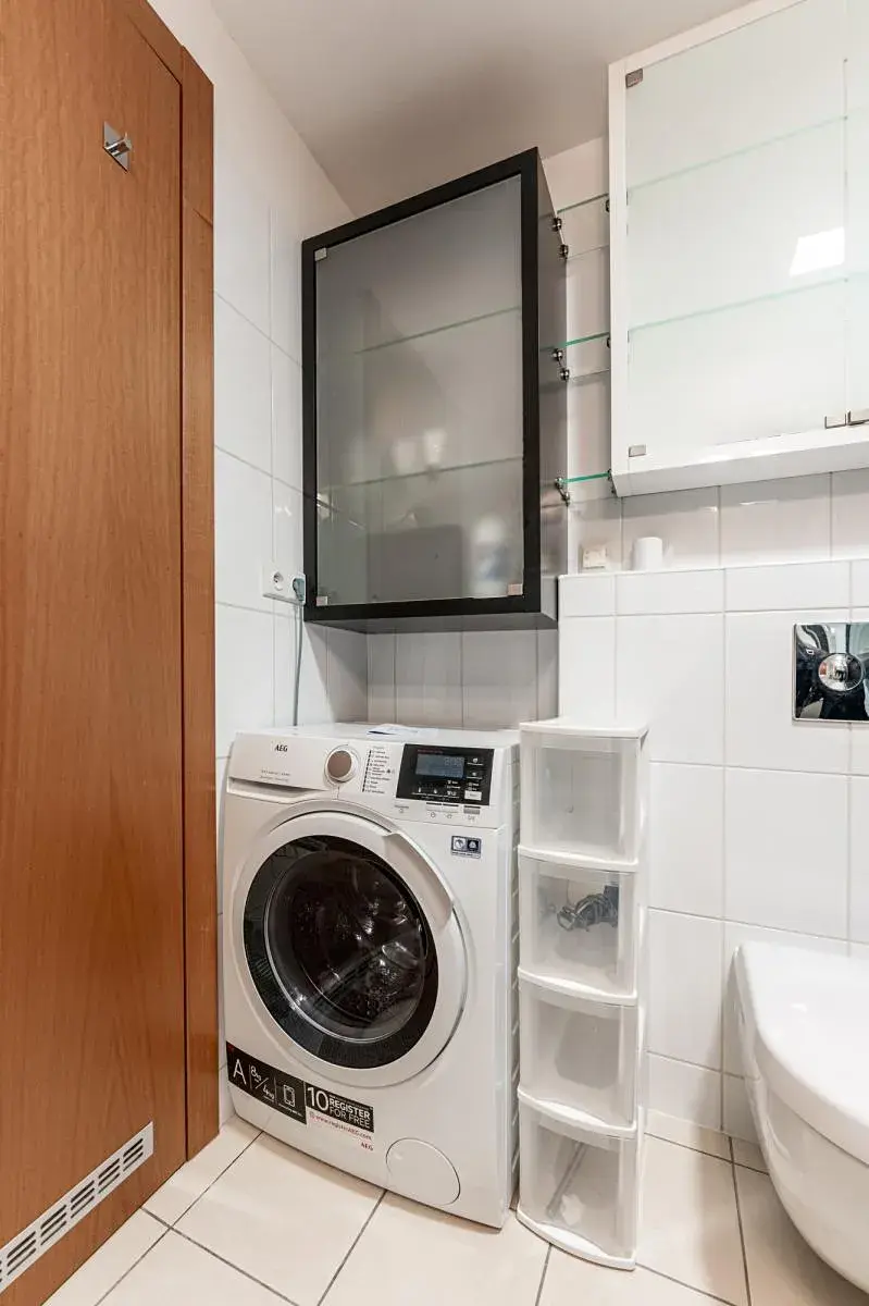 K jednotce, která se prodává jak tzv. stojí a leží tedy včetně vybavenáí moderním nábytkem (skutečnost lehce rozdílná než na fotografiích) a spotřebiči, náleží rovněž sklep o velikosti 4,6 m2 a garážové parkovací stání v suterénu budovy. Obyvatelům domu je k dispozici také kolárna.