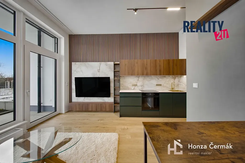 Jednotka s dispozicí 1+kk o podlahové ploše 35,2 m² se nachází v přízemí a vyniká precizním zpracováním veškerého nábytku na míru. Každý centimetr prostoru je využit efektivně a vkusně, což doplňují nadstandardní prvky jako jsou předokenní rolety pro dokonalé soukromí i tepelnou pohodu. Interiér kombinuje moderní design s praktičností, což dokazuje například spací patro s kvalitní matrací nebo velkorysé pracovní místo pro dvě osoby umístěné pod ním.