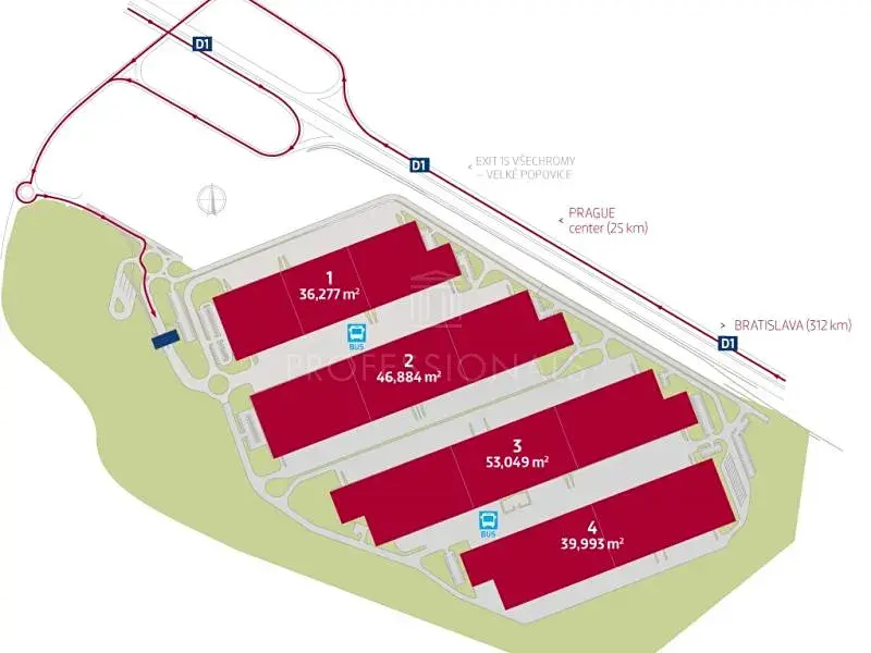 Skladové a kancelářské plochy v blízkosti Prahy k pronájmu. Jednotná výška skladů 10 m. Prostory vhodné též pro lehkou výrobu. Prvotřídní infrastruktura a zázemí areálu. Správa a řízení provozu přímo v areálu. Finální specifikace prostor na přání uživatele. Variabilní plocha kancelářských prostor. K dispozici Cross docking. Instalační dispozice 1 nakládací rampy min. na 888 m2 skladové plochy. Nejmenší jednotky jsou ve likosti okolo 1200 m2. Volný sklad 23.569 m2 + kanceláře se zázemím 1.183 m2.