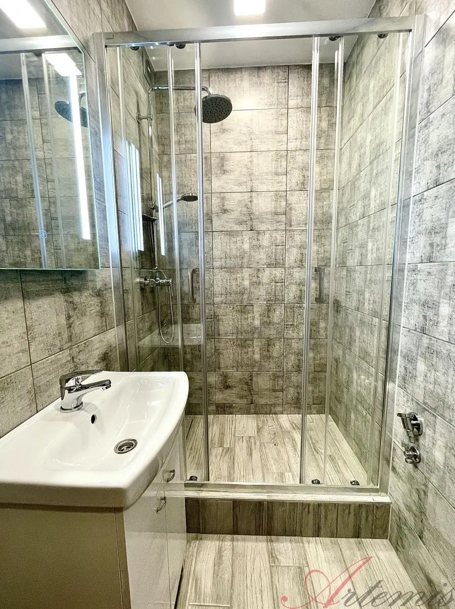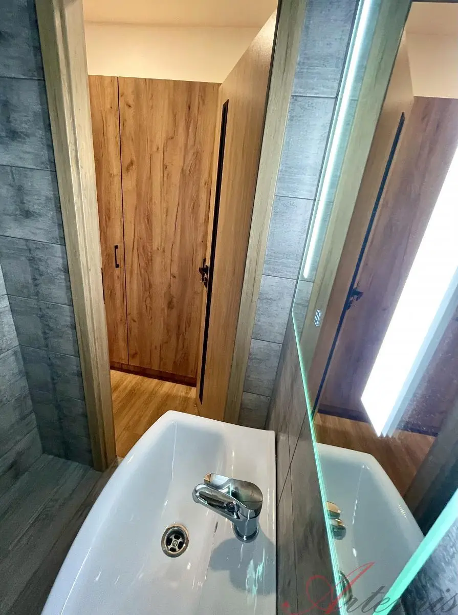 Nově zrekonstruovaný slunný byt je situován na jihovýchodní stranu a nachází se v sedmém podlaží revitalizovaného domu. Disponuje kuchyňskou linkou s indukční varnou deskou, elektrickou troubou, vestavnou lednicí, mrazákem, myčkou, mikrovlnnou troubou, neméně digestoří. (výrobce Beko) Podlahové krytiny tvoří vinylové plovoucí podlahy, v sociálním zařízení je dlažba. Koupelně dominuje prostorný sprchový kout, chodbě objemná šatní skříň.