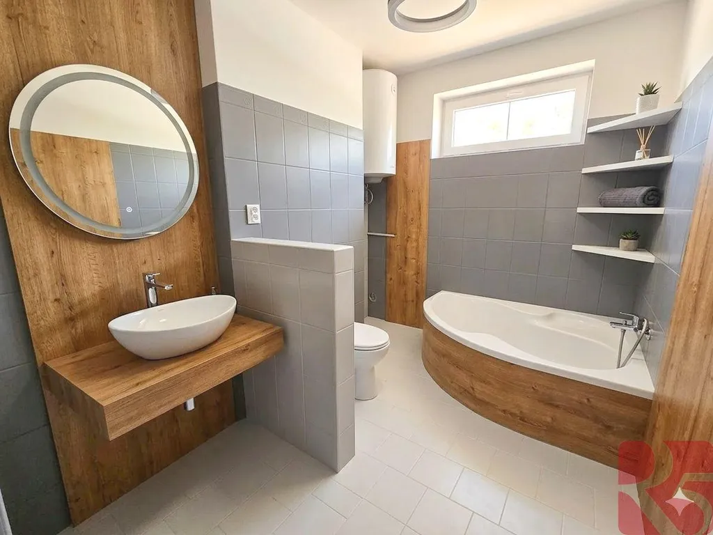 Koupelna má okno je s vanou a lze oddělit toaletu.