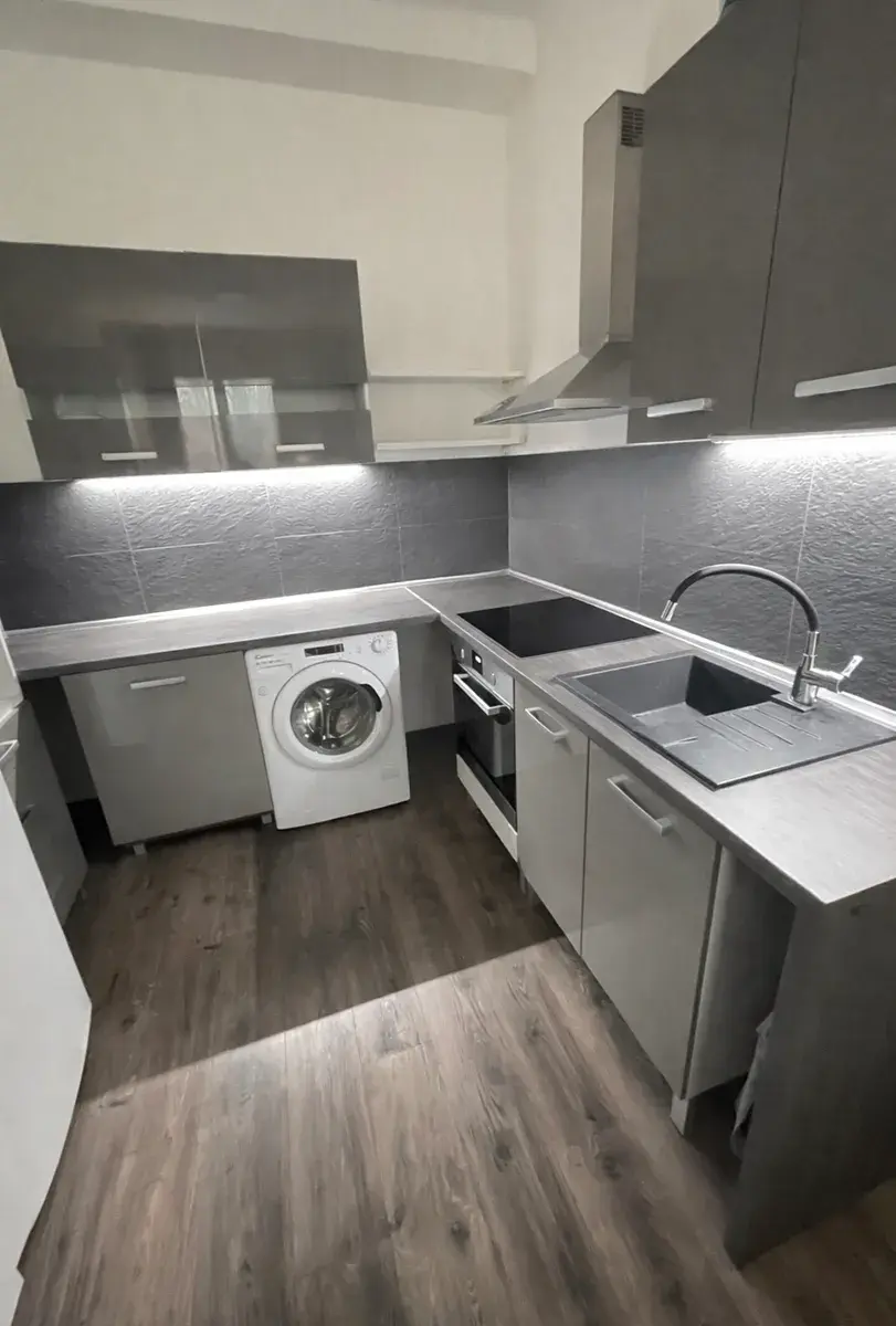 Jeden pokoj má kuchyňský kout s plně vybavenou kuchyňskou linkou- lednice, el.trouba, el.sklokeramická deska, myčka nádobí, digestoř a pračka.