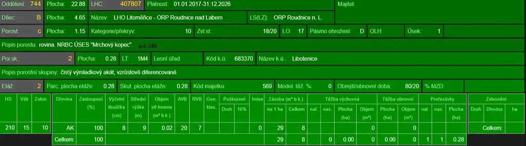 - p.č. 165 vedená jako lesní pozemek o celkové výměře 50 289 m2 (stáří lesa 108 let - zastoupení dřevin akát, borovice, dub, stáří 54 lesa let - zastoupení dřevin borovice, stáří lesa 46 let - zastoupení dřevin borovice, stáří lesa 44 let - zastoupení dřevin borovice, akát, modřín, stáří lesa 24 let - zastoupení dřevin akát).