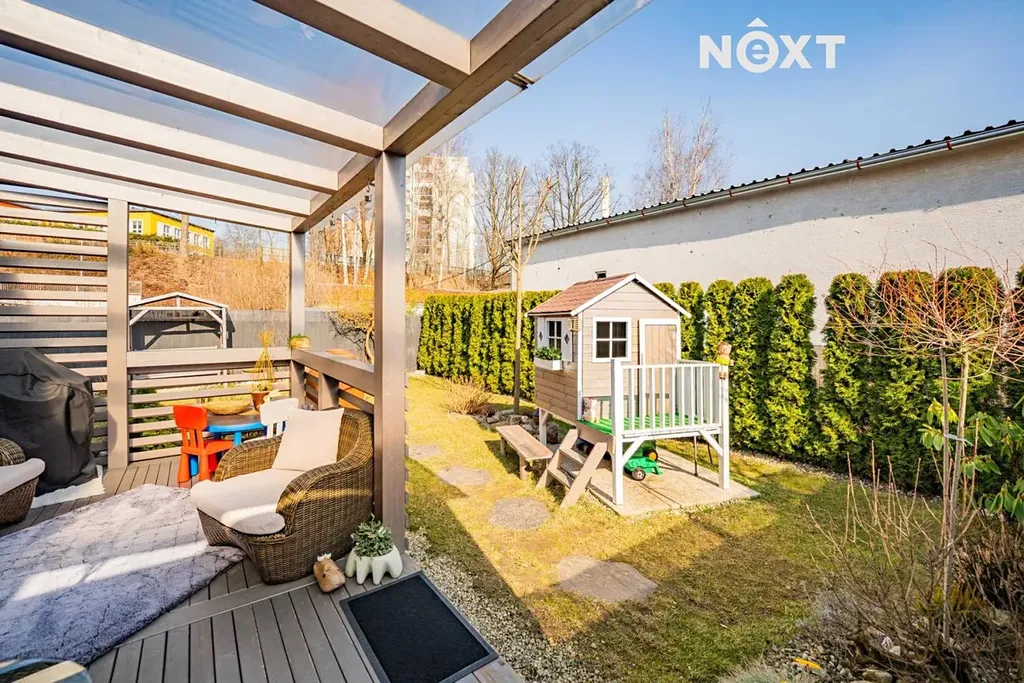 Z obývacího pokoje je přímý vstup na vlastní předzahrádku o velikosti 133 m², která představuje skutečný nadstandard tohoto bydlení. Nabízí dostatek prostoru pro relaxaci, letní posezení, dětské hry nebo třeba malé zahradničení. Díky přímému vstupu z bytu se přirozeně stává prodloužením obytného prostoru a místem, kde si můžete užívat klid, soukromí a kontakt s přírodou.