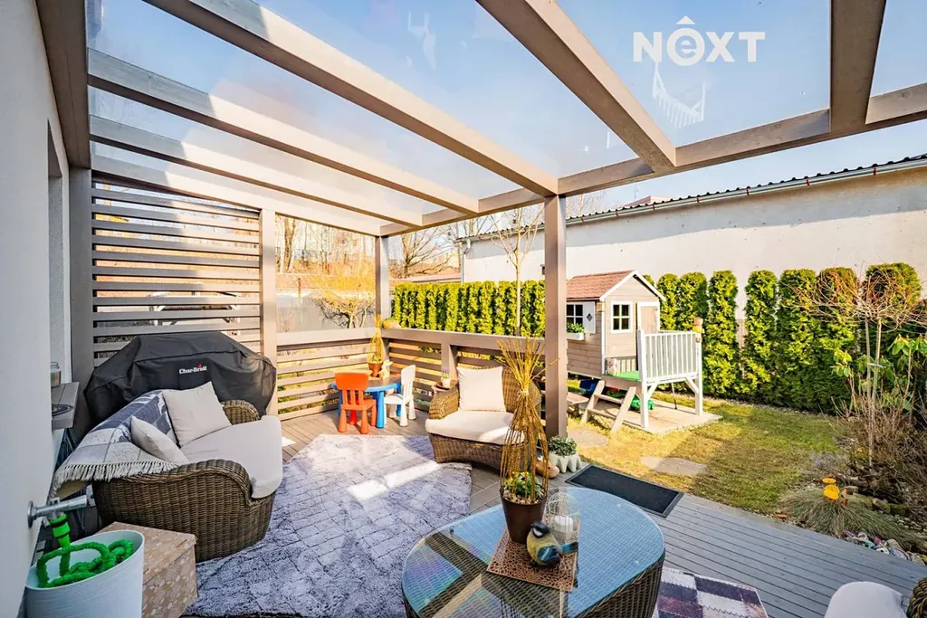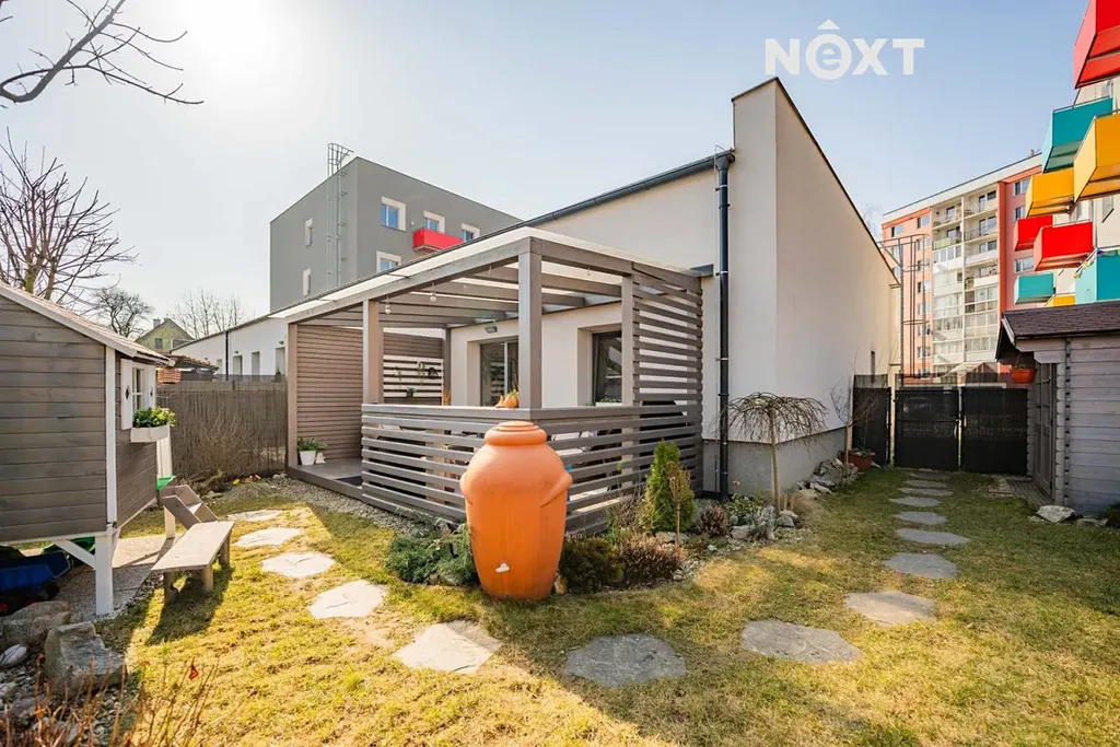 Byt o dispozici 3+kk a výměře 75 m² se nachází v přízemí krajní řadové zástavby, díky čemuž nabízí příjemnou kombinaci bydlení mezi bytem a rodinným domem. Velkou výhodou je takřka bezbariérový přístup.