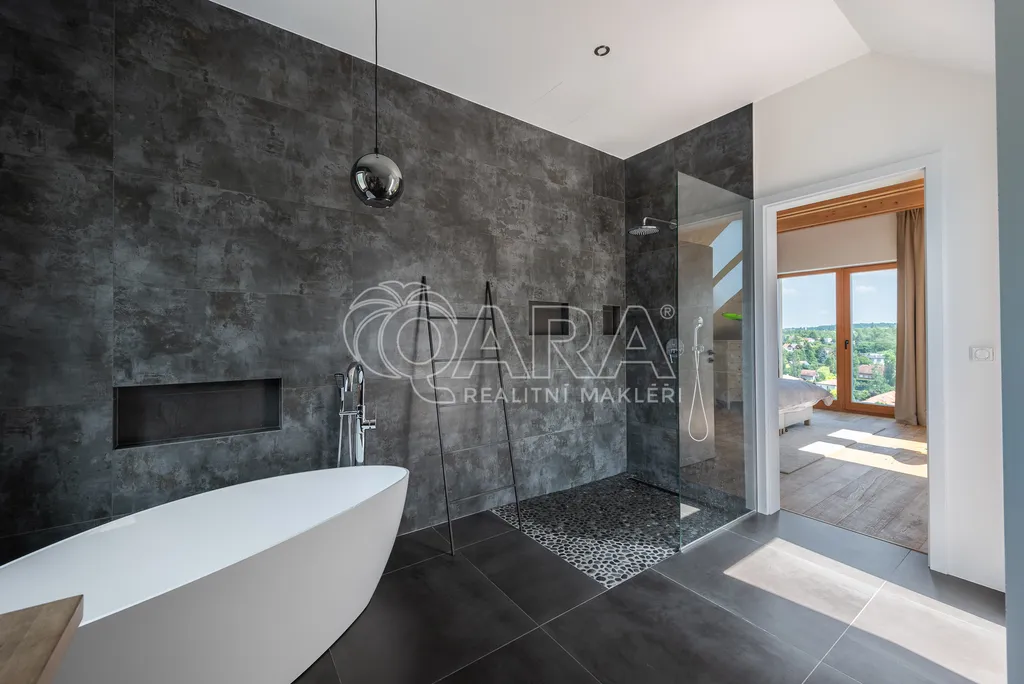 Nabízíme exkluzivní nízkoenergetickou vilu s bazénem a panoramatickým výhledem do údolí Únětického potoka.