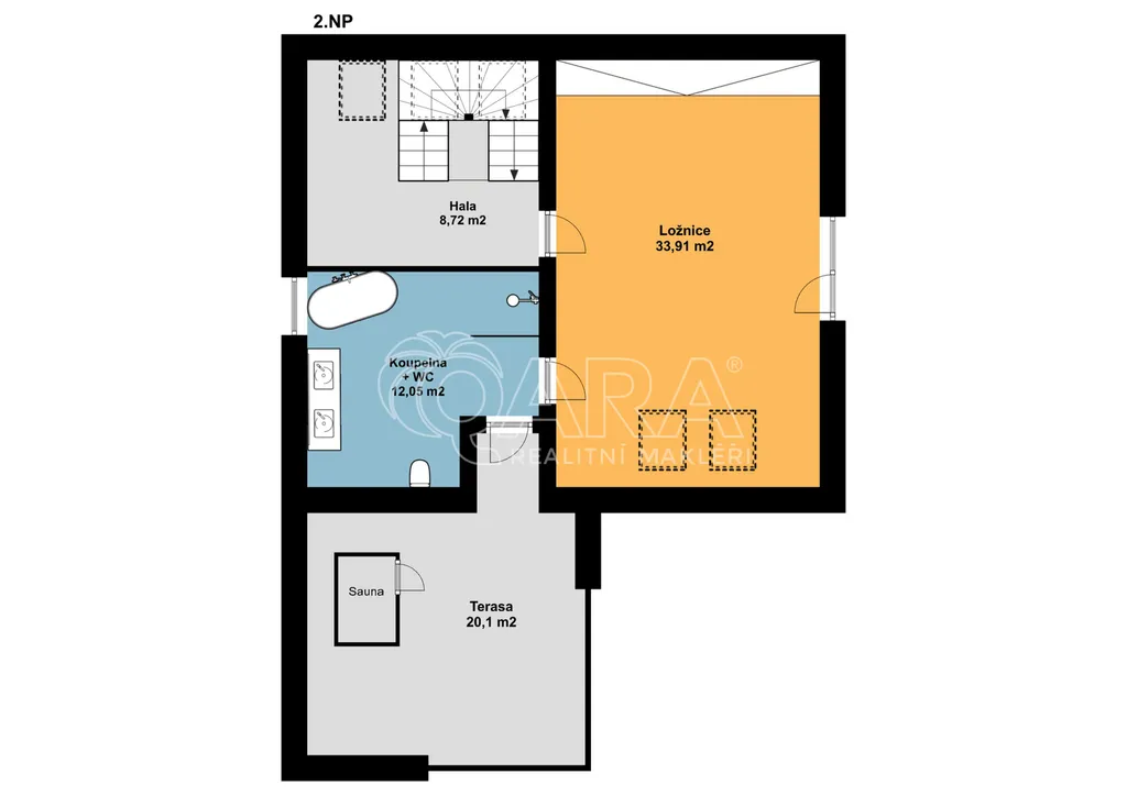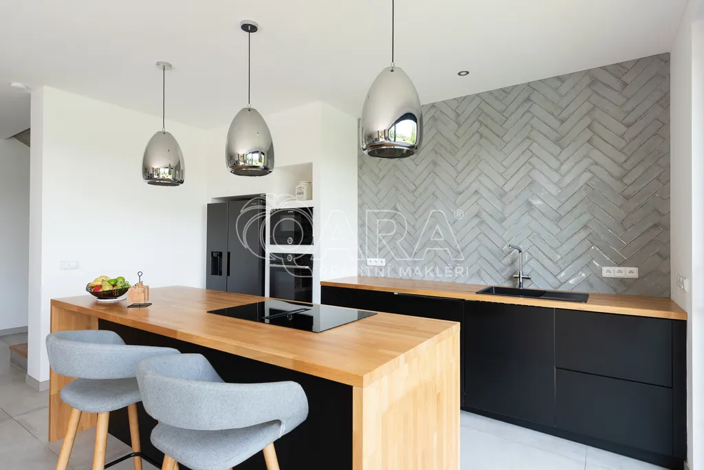 Třípodlažní dům s rozlohou 219 m2, který je charakteristický minimalistickým interiérem a velkými okny, nabízí v přízemí velkorysý obývací pokoj s jídelnou a kuchyň s ostrůvkem. Dále se zde nachází pokoj využitelný například pro relaxaci nyní zařízený jako jídelna. Praktická je technická místnost s přípojkou na pračku a sušičku a toaleta. Z obývacího pokoje je přímý výstup na terasu. V prvním patře, do kterého se vstupuje z ulice, se nachází tři samostatné ložnice a velká koupelna s volně stojící vanou, sprchovým koutem a toaletou. Ve druhém patře je rozlehlý podkrovní pokoj a další koupelna s volně stojící vanou, sprchovým koutem a toaletou. Dále je zde vstup na soukromou terasu se saunou.