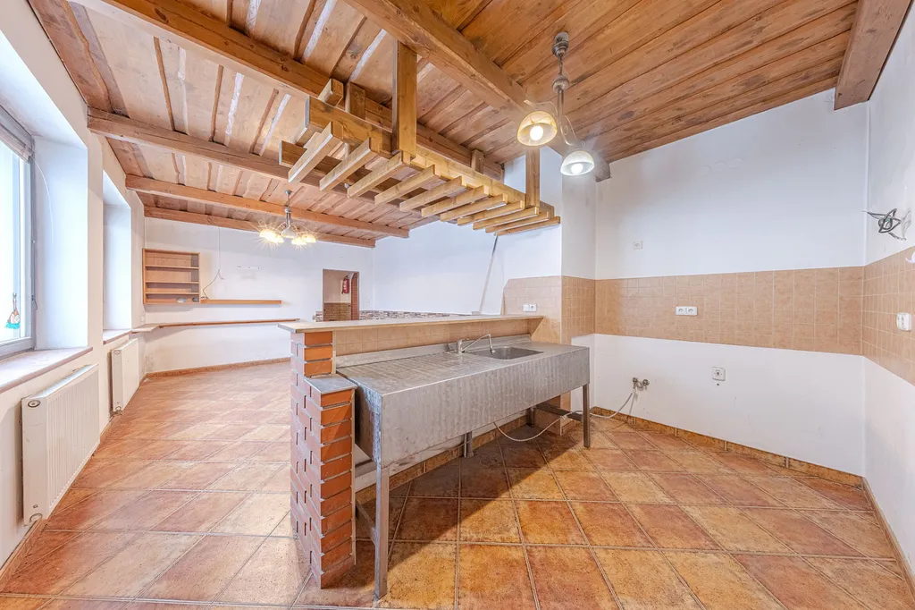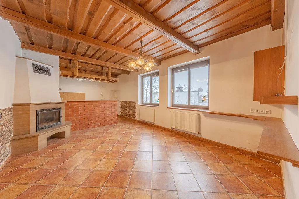 Součástí přízemí je také prostorná místnost o velikosti 14 m² s výhledem do dvora, která přímo navazuje na stájové prostory a umožňuje pohodlný průchod z domu do stájí.