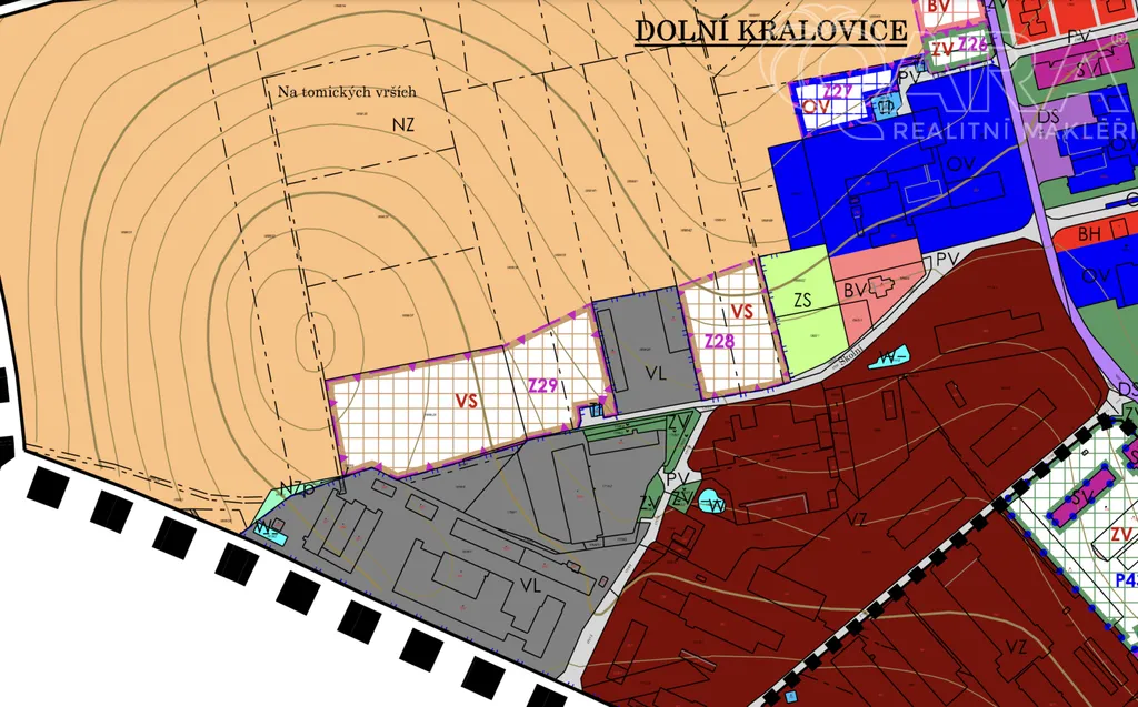 Celá plocha je v zastavitelném území. Dle územního plánu se jedná o plochy smíšené výrobní - výrobny a provozovny živnostenského charakteru (označení VS - Z29). Maximální celková zastavěná plocha je 1500 m². Možno postavit např. výrobní či skladovací halu. Max. výška stavby/budovy 15 m (1+P). Pozemek lze do budoucna rozdělit až na 4 parcely (minimální velikost každého nově vzniklého pozemku bude 2500 m²). Nyní však prodáváme jako celek.