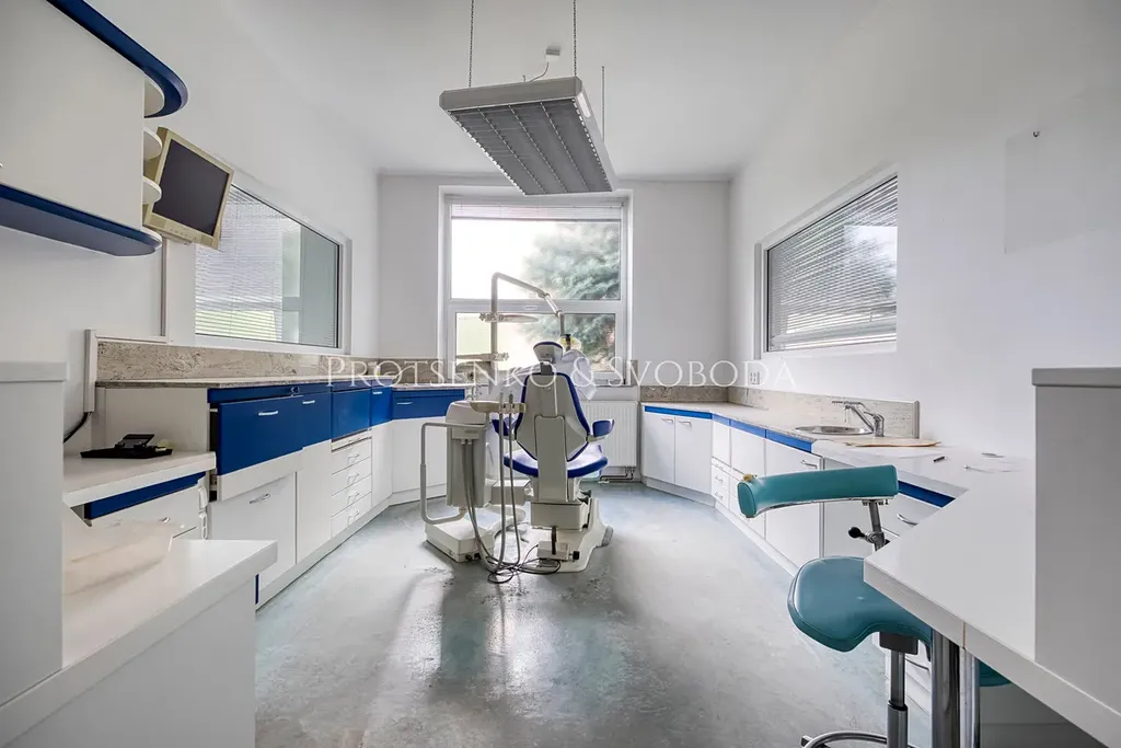 • Ordinace v přízemí (cca 130 m²) — čekárna, 3 samostatné ordinace, laboratoř, kancelář, sklady, sociální zázemí.