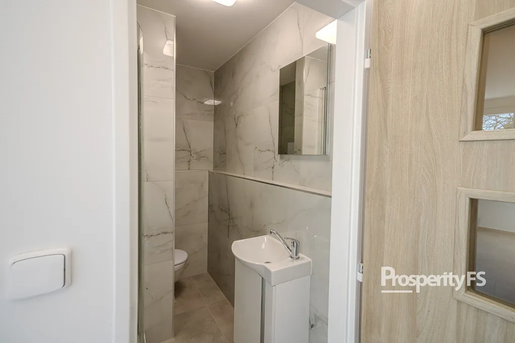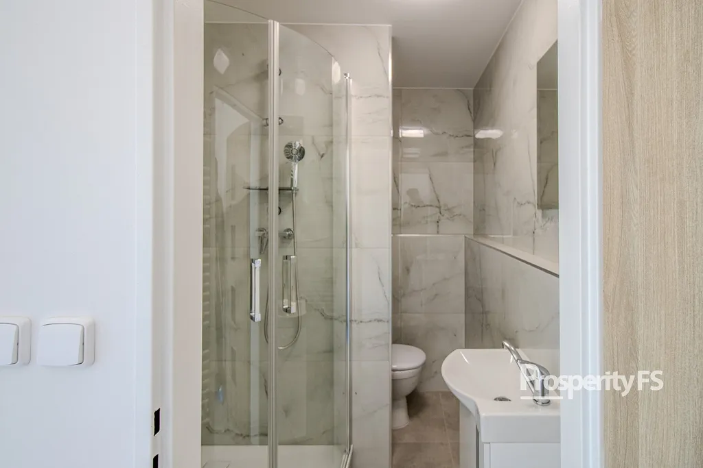 V bytě je nová kuchyňská linka vybavená sporákem se sklokeramickou varnou deskou, troubou a odsavačem par. V kuchyni je také příprava pro připojení pračky. Koupelna nabízí nový sprchový kout, umyvadlo a toaletu.