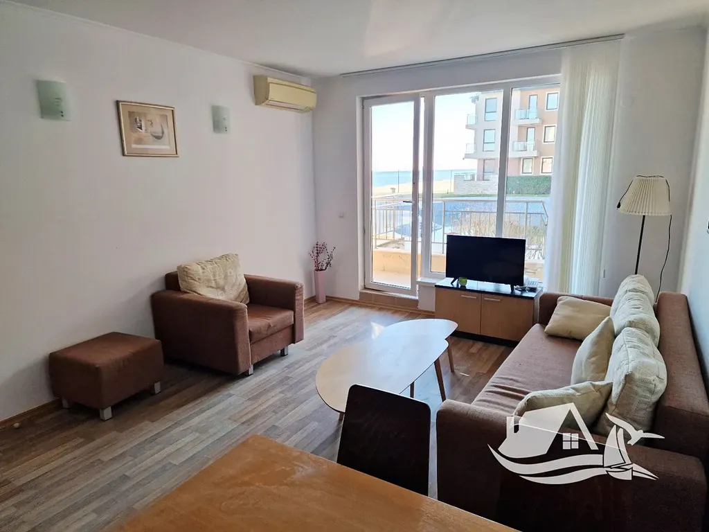 Nabízíme ke koupi nádherný dvoupokojový apartmán o celkové ploše 68 m², který se nachází ve vyvýšeném přízemí prestižního komplexu na první linii u moře ve městě Obzor. Tento apartmán má praktické a funkční uspořádání, které nezahrnuje žádné průchozí místnosti. Skládá se ze vstupní chodby, prostorného obývacího pokoje s kuchyňským koutem a jídelním prostorem, samostatné ložnice, koupelny s toaletou a velké terasy. Terasa je přístupná z obou místností a umožňuje přímý vstup k bazénu a na pláž. Z apartmánu se nabízí jedinečný výhled na moře i na bazén, což z něj činí ideální místo pro odpočinek a relaxaci.