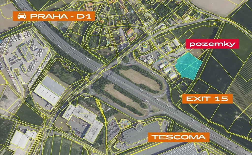 Přímo na Exitu 15 dálnice D1, naproti Mountfieldu a velkému logistickému parku P3 PRAGUE D1.