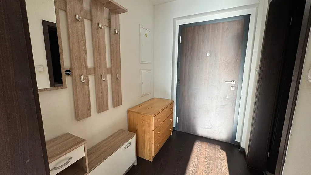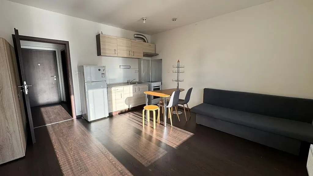 Kuchyň je vybavena lednicí, sporákem, troubou a úložnými skříňkami. V bytě je jídelní stůl se židlemi, pohovka, komoda s televizí a další základní nábytek, takže je připravený k okamžitému nastěhování.