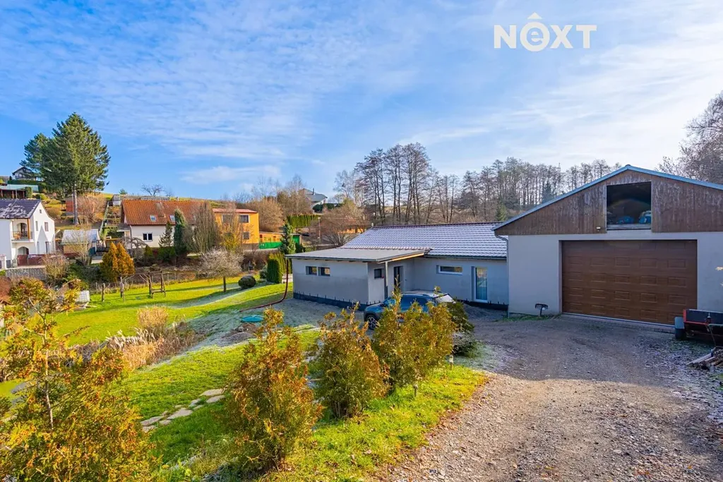 Na dům navazuje velká dvougaráž, která v současné době slouží jako autodílna. V ní je umístěn kotel na dřevěné pelety s rozvody do podlahového topení v celém domě, přičemž je možné připojit také elektrokotel. Ohřev vody zajišťuje elektrický bojler v technické místnosti. Dům byl budován postupně od roku 2019 a je před kolaudací, kterou zajistí stávající majitel. Objekt je zateplený, bude dokončena fasáda i venkovní dlažby okolo domu. PENB štítek je zadaný ve výrobě.
