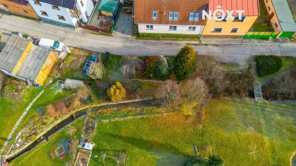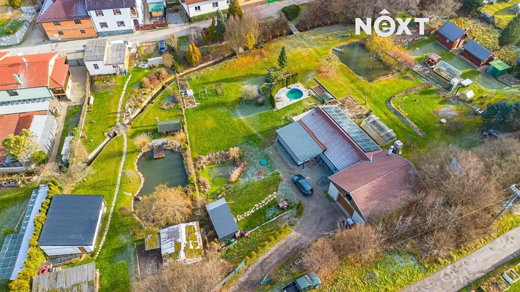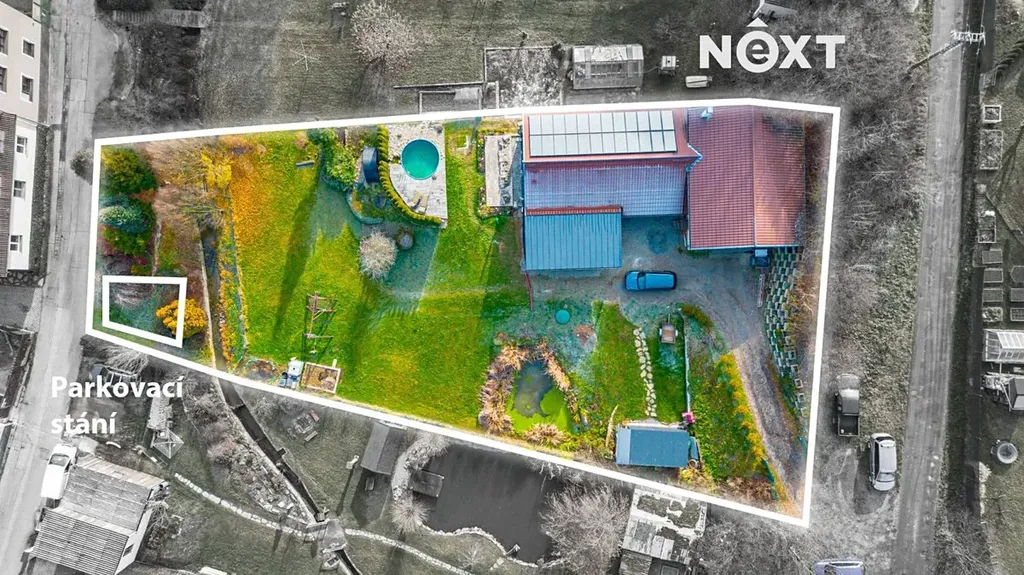 Na pozemku je vlastní studna s pitnou vodou a čistička odpadních vod. Zahrada nabízí příjemné soukromí a dost místa pro rodinný život – je zde terasa zastíněná stromy, bazén, dětské hřiště, zahradní domek na techniku a další úložný prostor. Pozemkem protéká potůček a za ním se nachází možnost dalšího parkování. Dům má tedy dva nezávislé příjezdy.