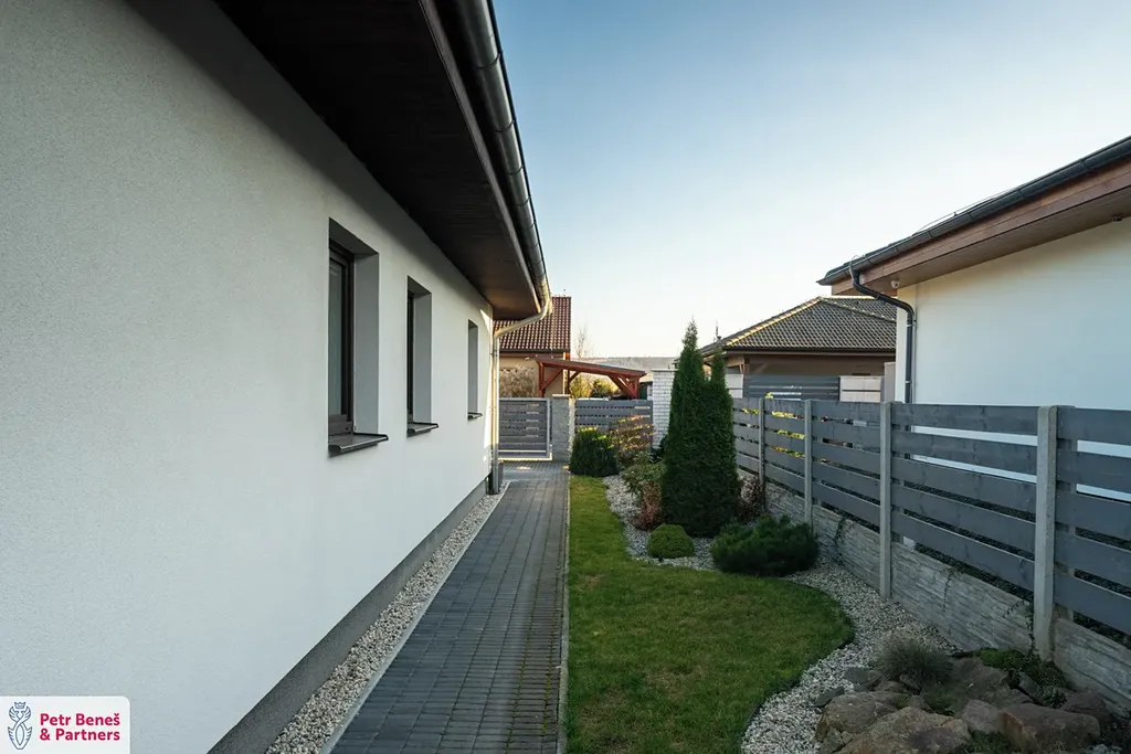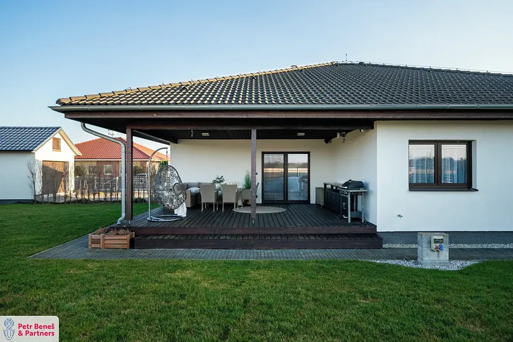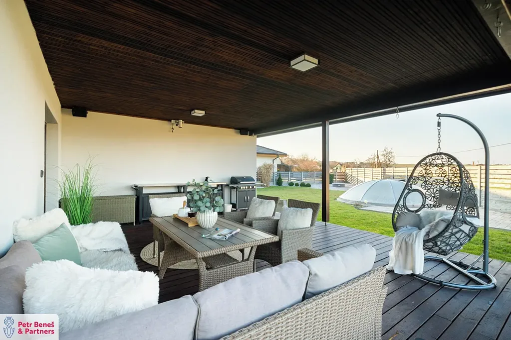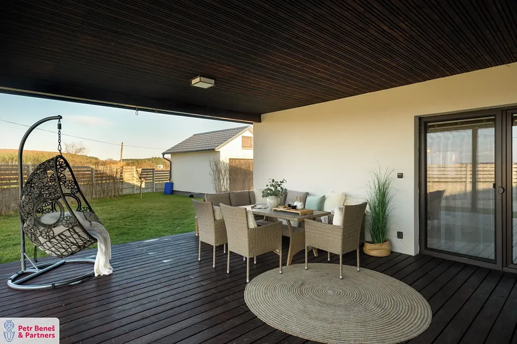 Výjimečným prvkem této nemovitosti je prostorná zastřešená terasa o velikosti přibližně 50 m². Ta vytváří ideální místo pro venkovní stolování, letní posezení s přáteli nebo klidné večery s výhledem do zahrady. Terasa přirozeně rozšiřuje obytný prostor domu a stává se jeho přirozeným pokračováním.