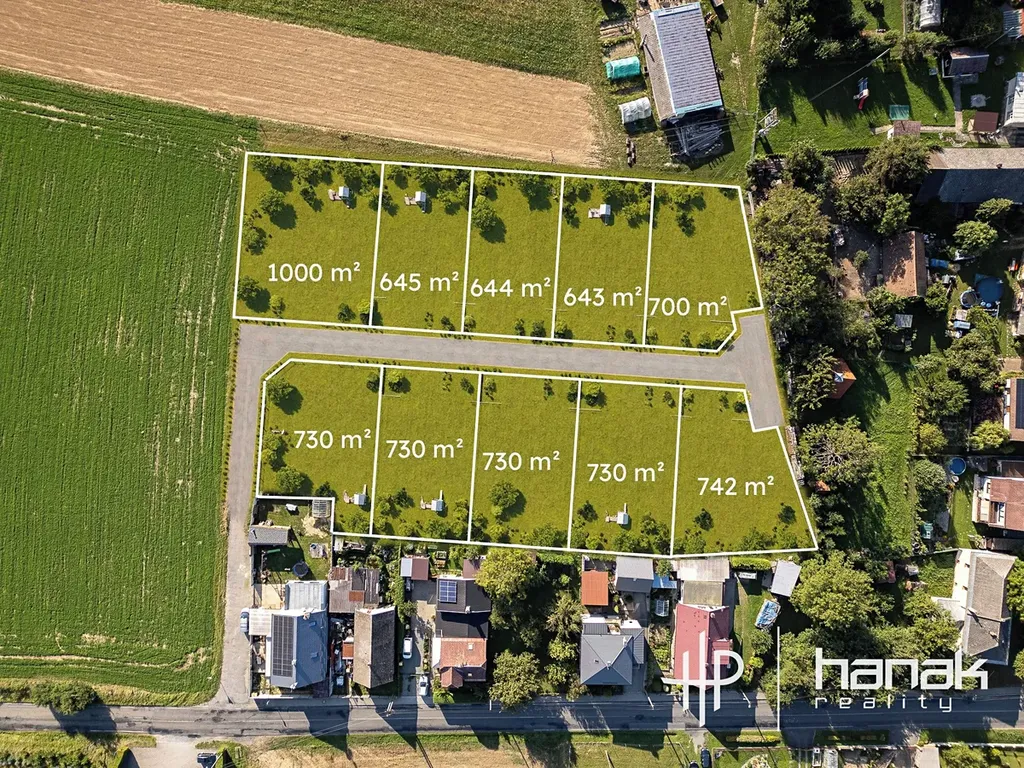 Základní členění nabízí 10 stavebních míst se středovou příjezdovou cestou. Rozměry pozemků jsou od cca 514 m2 do 746 m2 a budou kompletně zasíťované v druhé polovině r. 2026.