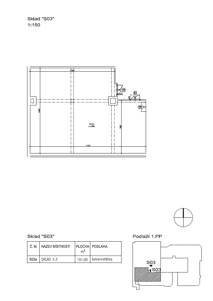 Sklad má plocha 191 m2, je umístěn v suchém suterénu (není nutné vytápění) s nákladním výtahem 1000 kg, kde se vejde paleta i s vozíkem.