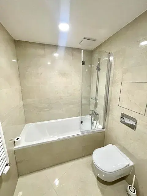 Vstupem do bytové jednotky se ocitnete v předsíni (4,7 m2) s vestavěnou skříní, z které je po pravé straně vstup do koupelny (5,2 m2) s vanou, toaletou, prostorem na pračku, umývadlem se spodní skřínkou a zrcadlem s osvětlením. Naproti vstupu do bytu se nachází obývací pokoj (19,9 m2) s kuchyňským koutem s novou kuchyňskou linkou včetně vestavných spotřebičů (kombinovaná lednice s mrazákem, horkovzdušná trouba, varná deska, odsavač par, mikrovlnná trouba a myčka nádobí). Z obývacího pokoje je vstup na balkon (4,7 m2) s nádherným výhledem na Prahu a dalekého okolí. Obývací pokoj je zároveň průchozí s ložnicí (12,3 m2) se šatnou (2 m2) a rovněž se vstupem na balkon.