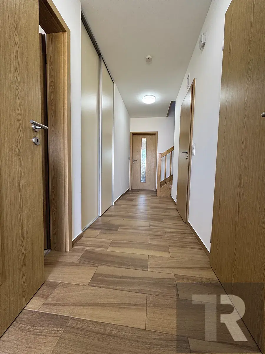 Dispozice domu: 1.NP - zádveří (3,25 m2), chodba (7,59 m2), obývací pokoj (33,01 m2), kuchyně (10,17 m2), technická místnost (4,47 m2), koupelna se sprchovým koutem a WC (3,11 m2), pracovna (8,07 m2); 2. NP - chodba (4,02 m2), dětský pokoj (11,78 m2), ložnice (15,94 m2), pokoj (15,97 m2), koupelna s vanou a WC (7,82 m2), komora (2,11 m2). K uskladnění např. sezonních věcí je k využití pochozí půda.