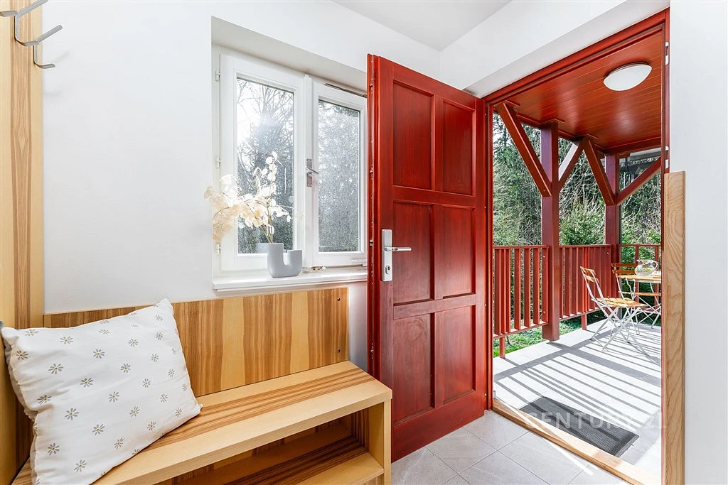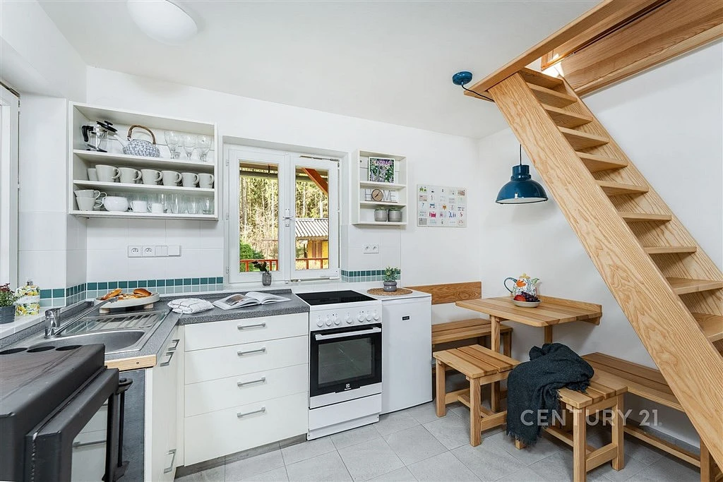 A protože se vám odsud velmi pravděpodobně nebude chtít odjet, je chata připravena i na variantu trvalého bydlení. Je napojena na veřejný vodovod s celoročním provozem, odpadní vody jsou řešeny velkokapacitní jímkou. Ohřev teplé vody obstarává elektrický boiler, teplo zase kamna na tuhá paliva.