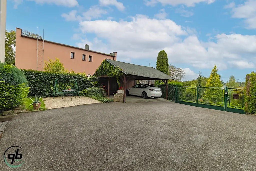 Pozemek: spoluvlastnický podíl 1/2 včetně zahrady, polovina parkování pod přístřeškem a další parkovací plochy před domem.