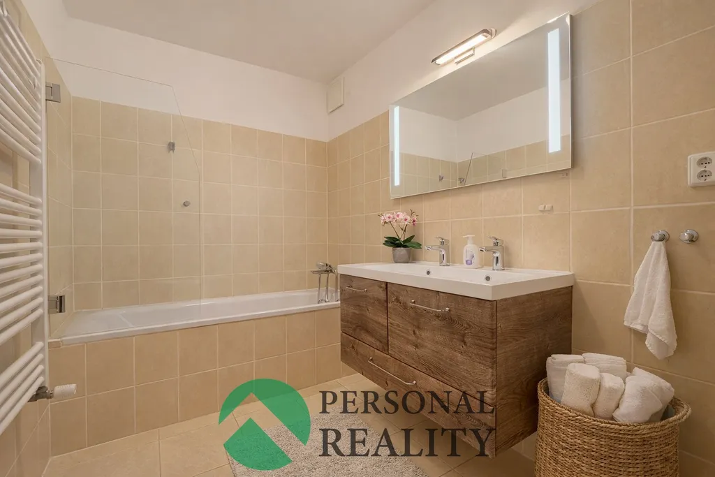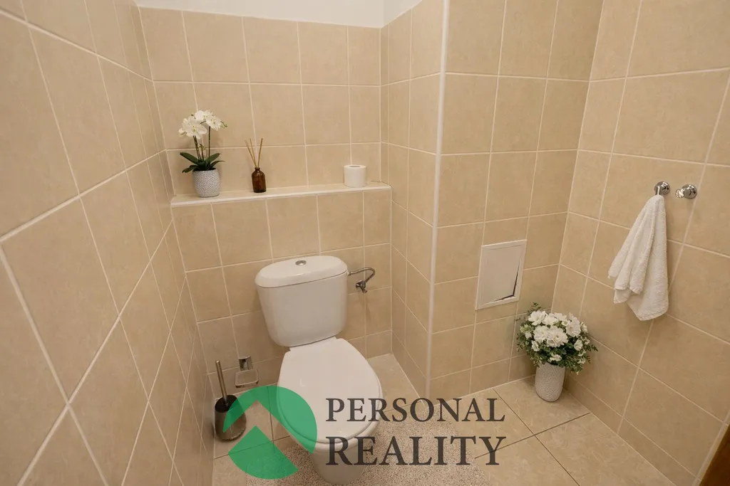 Dispozice bytu je velmi praktická a nabízí prostornou vstupní chodbu, ze které je přístup do všech místností. Součástí bytu je koupelna s vanou, umyvadlem, topným žebříkem a přípojkou na pračku, dále samostatné WC a velká komora, která poskytuje dostatek úložného prostoru.