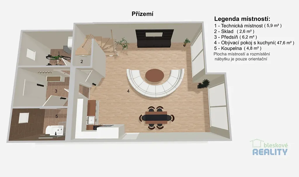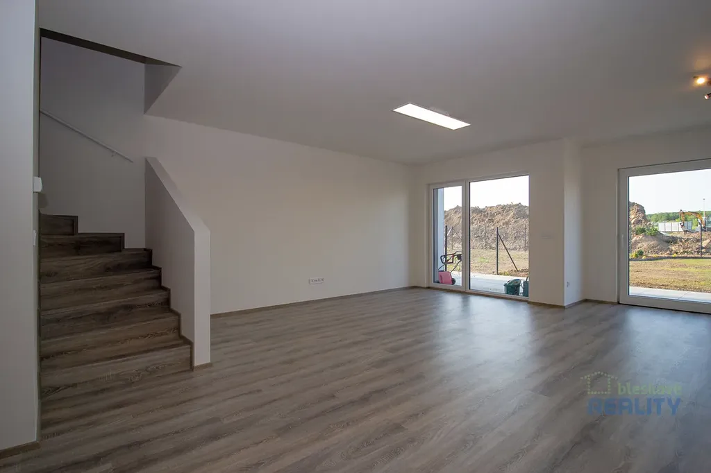 Dominantou domu je prostorný obývací pokoj s kuchyňským koutem, který plynule navazuje na soukromou zahradu o velikosti 277 m². Ta nabízí ideální prostor pro relaxaci, rodinné posezení i dětské hry.