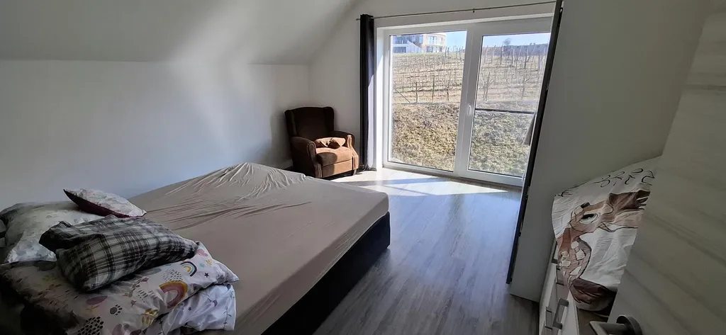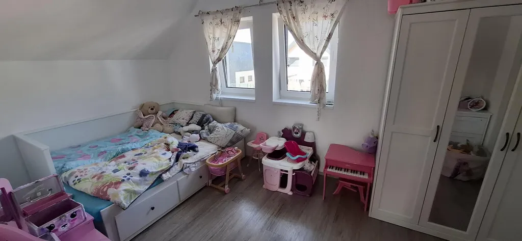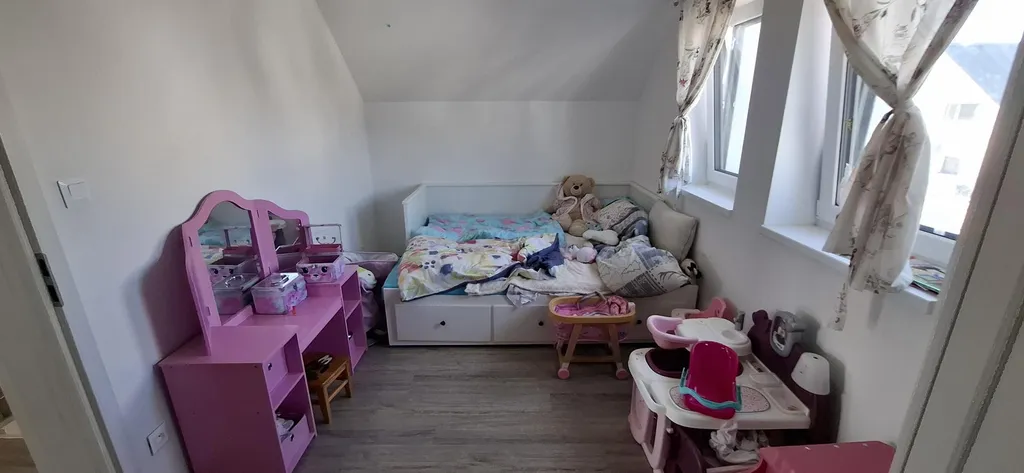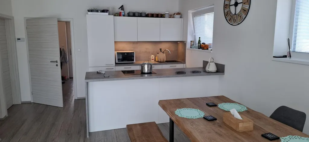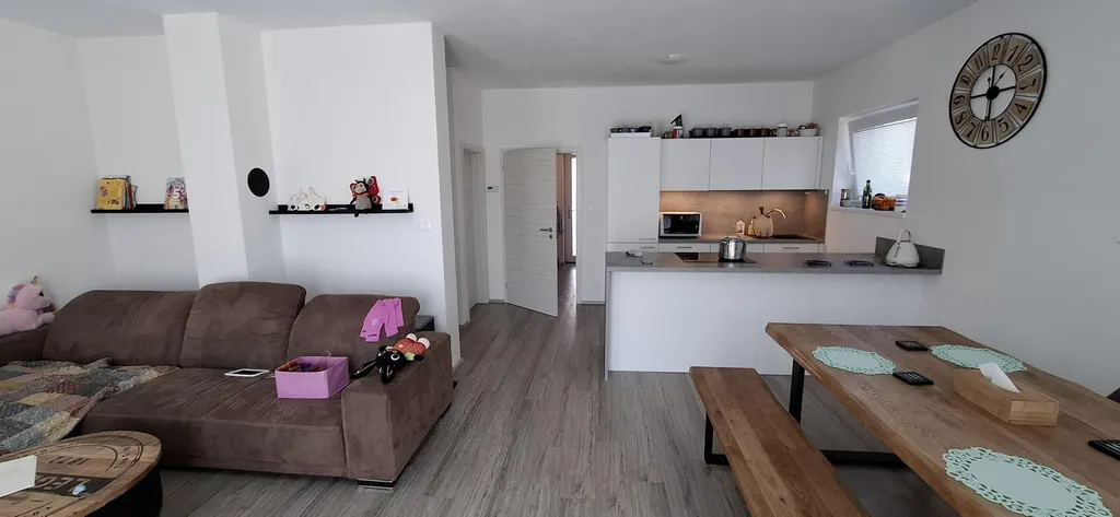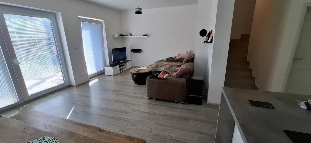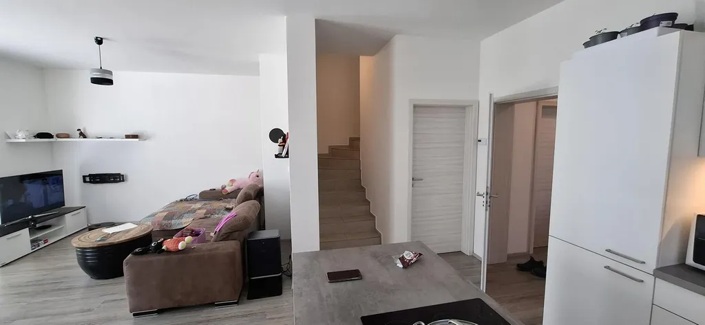1.patro: hala, samostatné vstupy do tří pokojů, koupelna s vanou a WC, šatna. Teplovodní podlahové topení, elektrický kotel se zásobníkem na ohřev vody, plastová okna trojsklo, na podlaze dlažba a lepená vinylová podlaha, kuchyňská linka včetně spotřebičů. V obci veškerá občanská vybavenost. Volný od 1.6-2026.