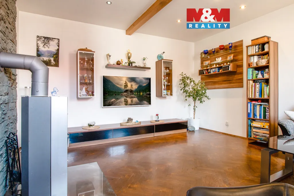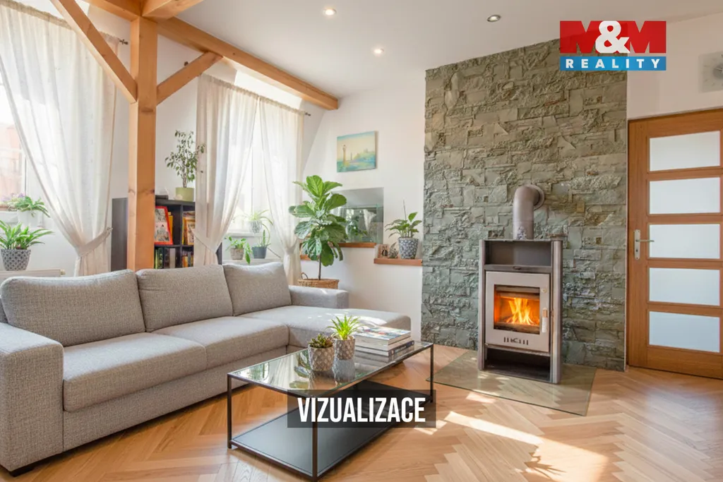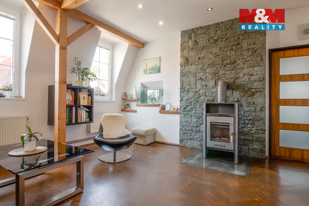 Nemovitost se nachází ve druhém patře, což zajišťuje dostatek klidu a světla. Interiér je ve velmi dobrém stavu a jeho pomyslným srdcem je obývací pokoj s krbovými kamny, která vykouzlí hezkou atmosféru.