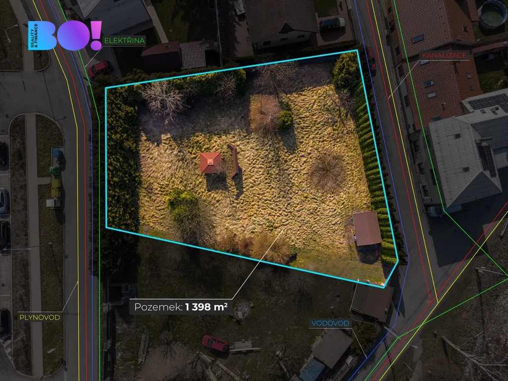 Velkorysá plocha 1 398 m²: dost prostoru na dům snů, bazén, pergolu i dětské hry.