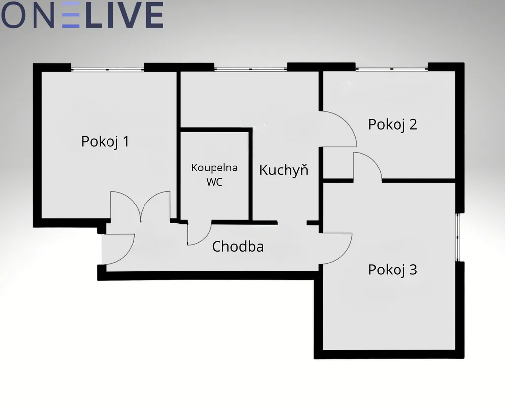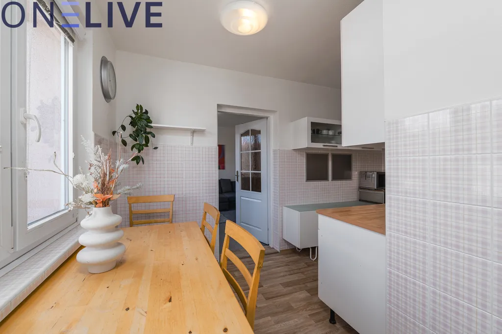Dispozici tvoří tři samostatné pokoje a prostorná kuchyně s jídelním koutem, která nabízí dostatek místa pro každodenní rodinný život. Výhodou je zděné bytové jádro.
