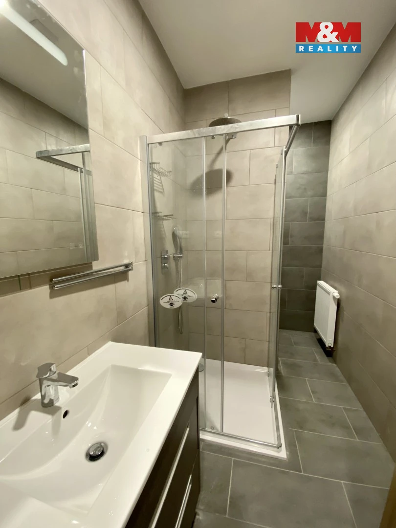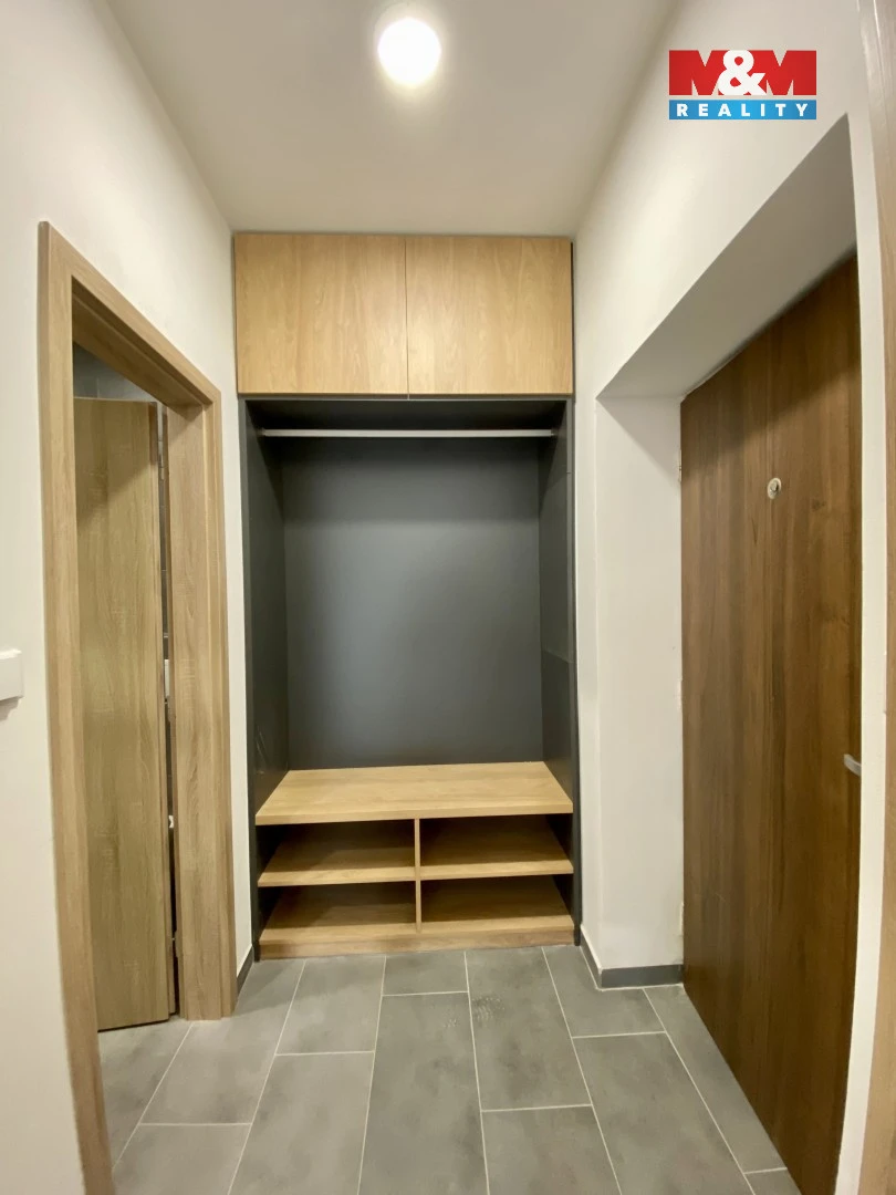 Při vstupu do bytu je na pravé straně zabudovaná skříň s botníkem. Hned naproti vstupním dveřím je vstup do koupelny se sprchovým koutem, přívodem na pračku a plynovým kotlem.