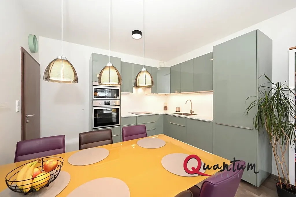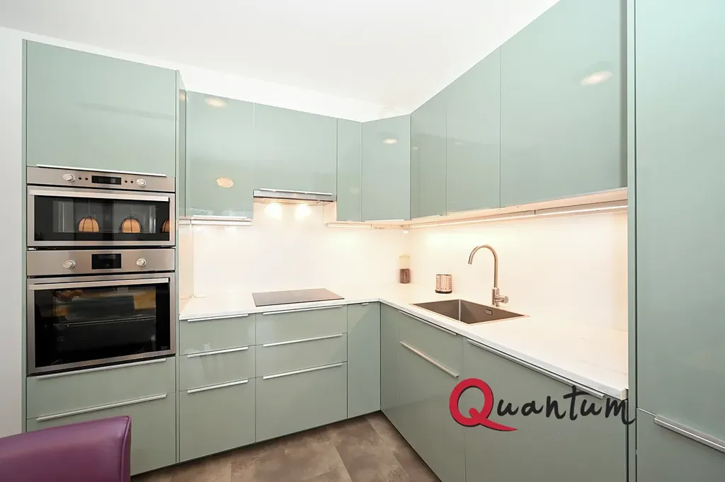 Plně vybavená kuchyňská linka s moderními spotřebiči (trouba, varná deska, lednice, myčka).