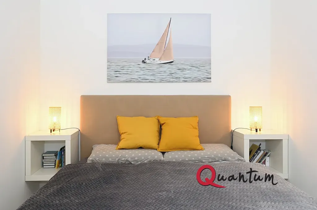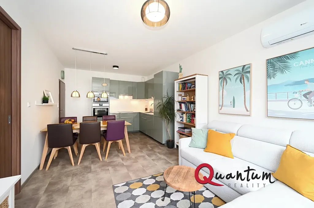 Prostorný obývací pokoj s klimatizací a přímým vstupem na balkón, který je ideální pro ranní kávu nebo večerní relaxaci.