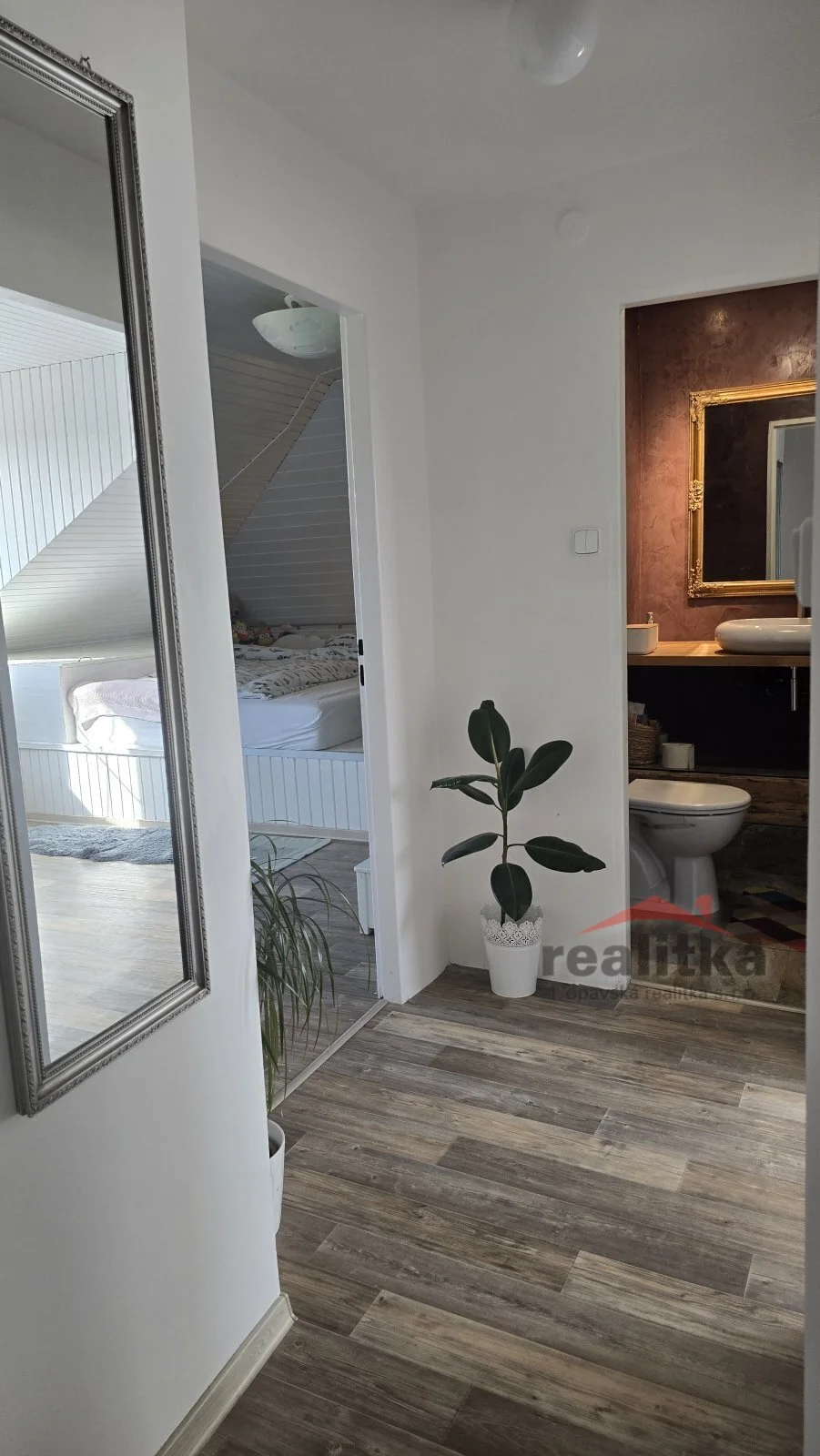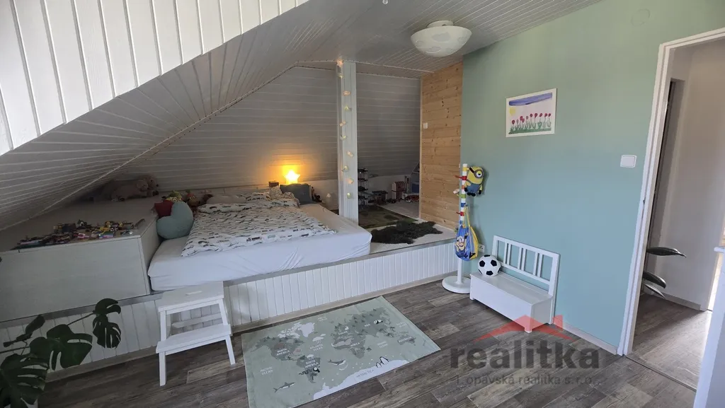 Točitým schodištěm se dostáváme do 1. patra, kde jsou 3 samostatné ložnice se zabudovaným nábytkem, skříněmi a plynový kotel na vytápění. Zájemci o prohlídku dle domluvy s paní Gratzovou.