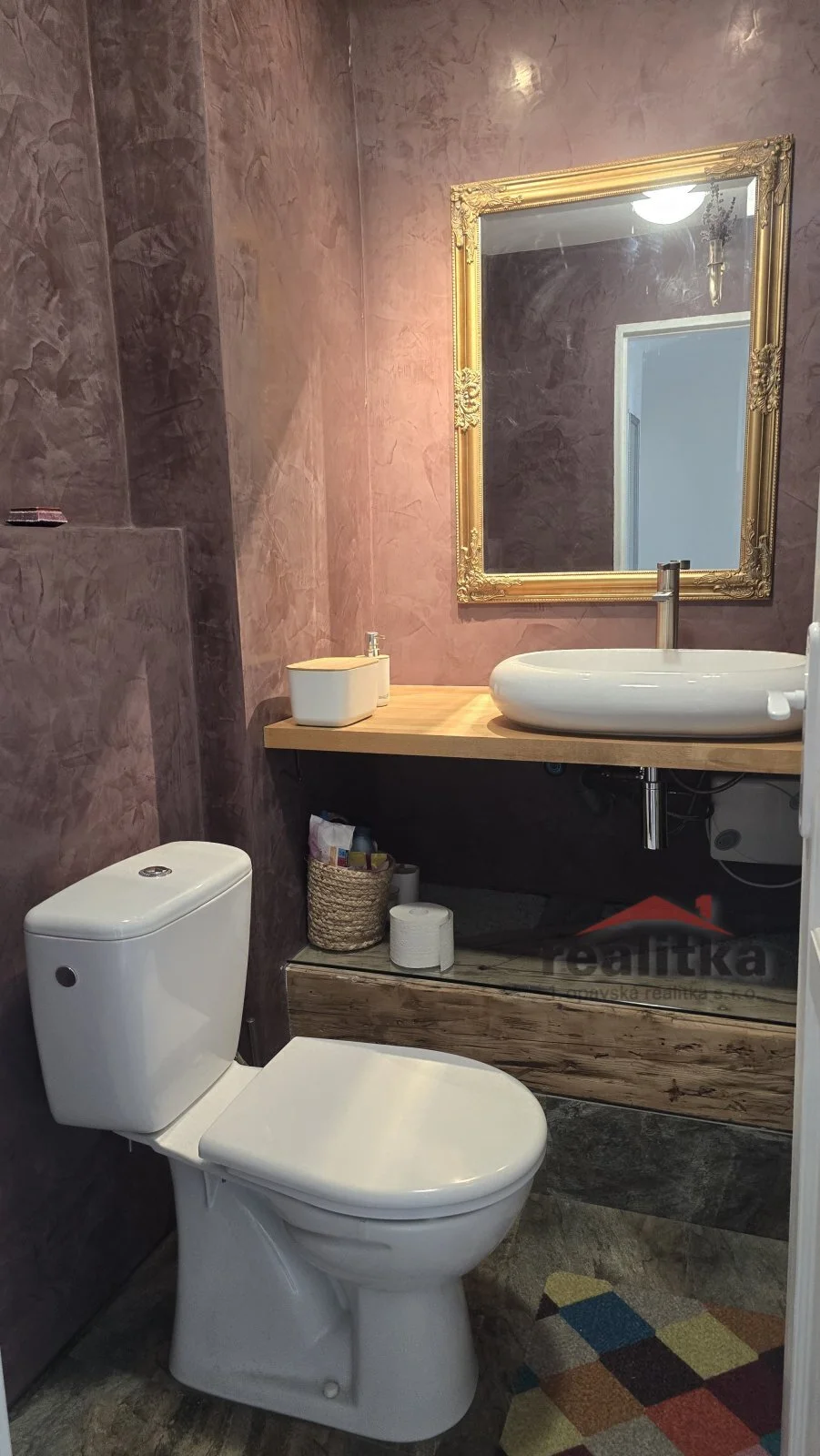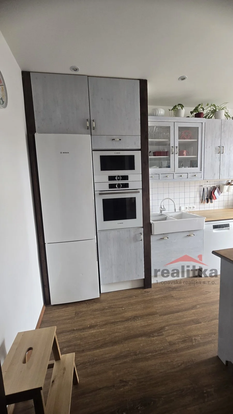 Ve spodním patře se nachází obývací pokoj s pracovnou, kuchyňská část se vstupem na balkón s nádherným výhledem na řeku, v kuchyni je zabudovaná elektrická trouba, mikrovlnka, lednice s mrazákem a myčka značky Bosch. V předsíni jsou vestavěné skříně, kde je umístěna pračka, sušička a elektrický bojler na vodu, v koupelně je rohová vana, dvě umyvadla, okno opět s výhledem na řeku a zvlášť wc. V koupelně je podlahové topení.