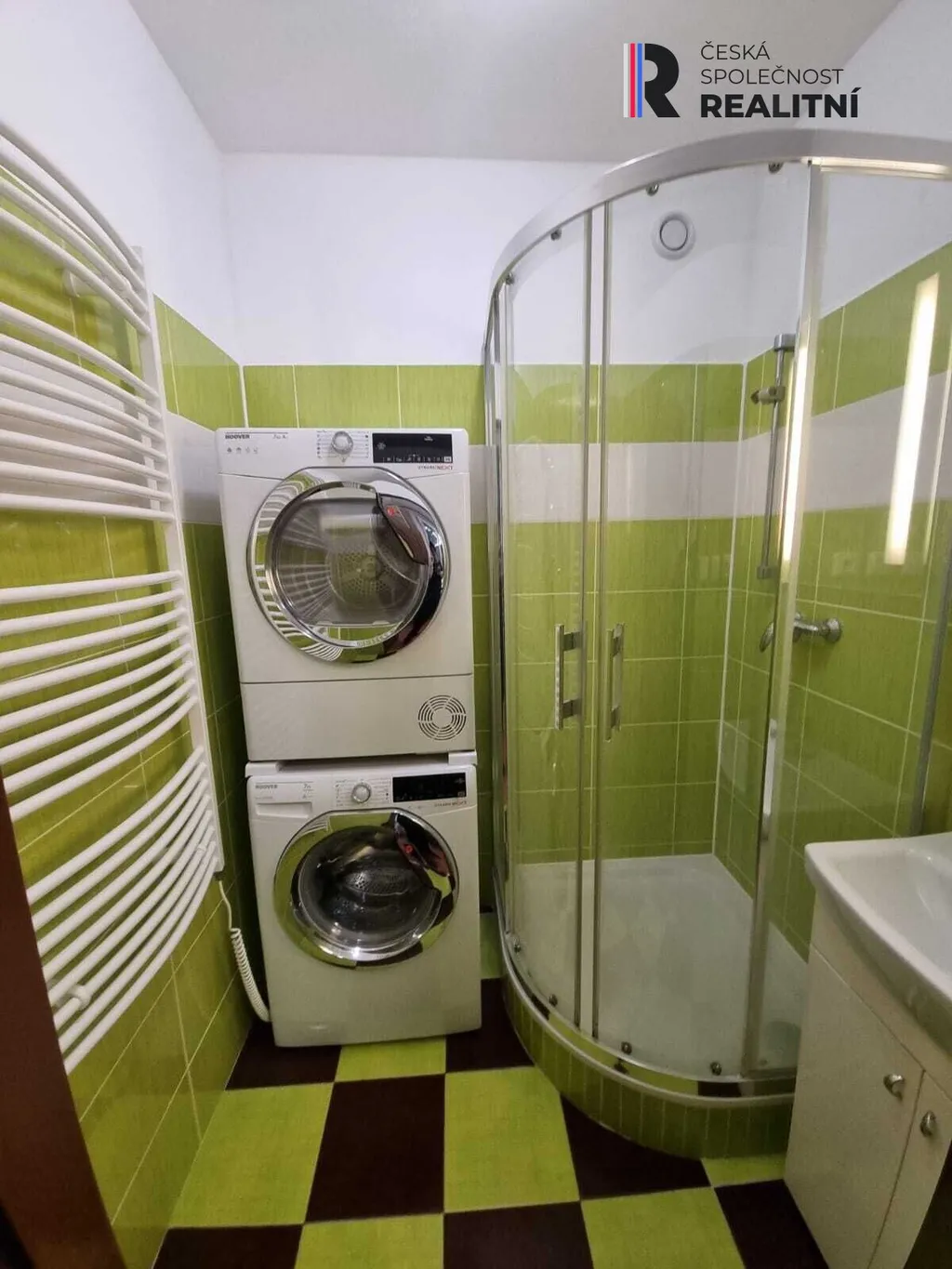 Koupelna se sprchovým koutem, umyvadlem, pračkou a sušičkou.